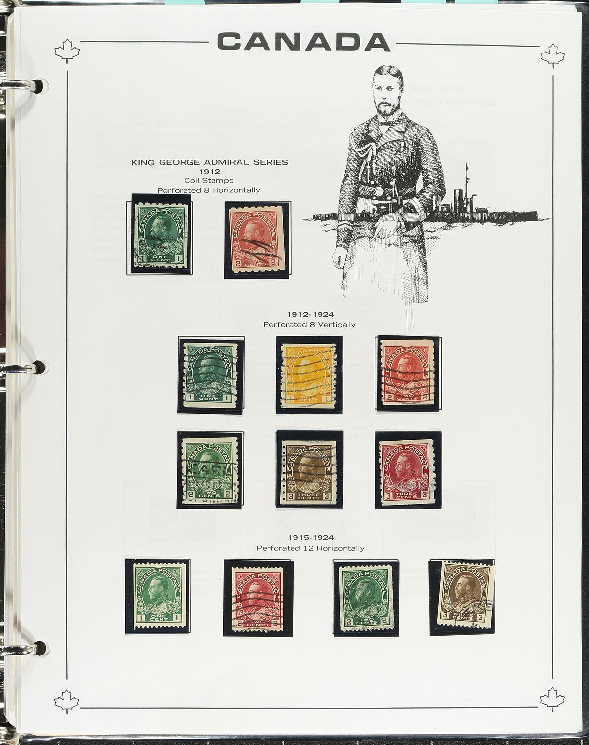 Well organized collection of used Canada in a Unitrade "Canada Junior" album, 1859-1983, containing many hundreds of stamps, primarily in hingeless mounts. The collection generally ranges from Scott #14/1008, containing sets, partial sets, and coil issues noting Scott #s 14-15, 18, 21-22, 25, 29-30, along with 25 Small Queens (10c (x2), 20c and 50c Widow Weeds), partial sets of Leafs and Numerals, complete sets of Edwards, Quebecs, Admirals Scrolls right up to the Peace issues, including coil singles for most classic issues noting #123-124 (c.v. $130 total). Postmark interest includes mostly cds cancels including a few 'socked on the nose' town postmarks. A nice collection that fills the classic area of Canada and should be continued right up to modern day. A few small faults with a few of the early issues, overall fine to very fine. Estimate =