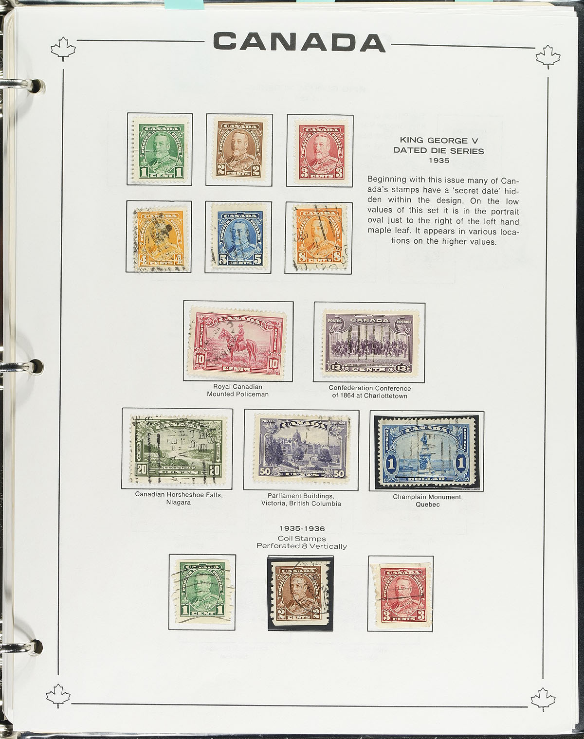 Well organized collection of used Canada in a Unitrade "Canada Junior" album, 1859-1983, containing many hundreds of stamps, primarily in hingeless mounts. The collection generally ranges from Scott #14/1008, containing sets, partial sets, and coil issues noting Scott #s 14-15, 18, 21-22, 25, 29-30, along with 25 Small Queens (10c (x2), 20c and 50c Widow Weeds), partial sets of Leafs and Numerals, complete sets of Edwards, Quebecs, Admirals Scrolls right up to the Peace issues, including coil singles for most classic issues noting #123-124 (c.v. $130 total). Postmark interest includes mostly cds cancels including a few 'socked on the nose' town postmarks. A nice collection that fills the classic area of Canada and should be continued right up to modern day. A few small faults with a few of the early issues, overall fine to very fine. Estimate =