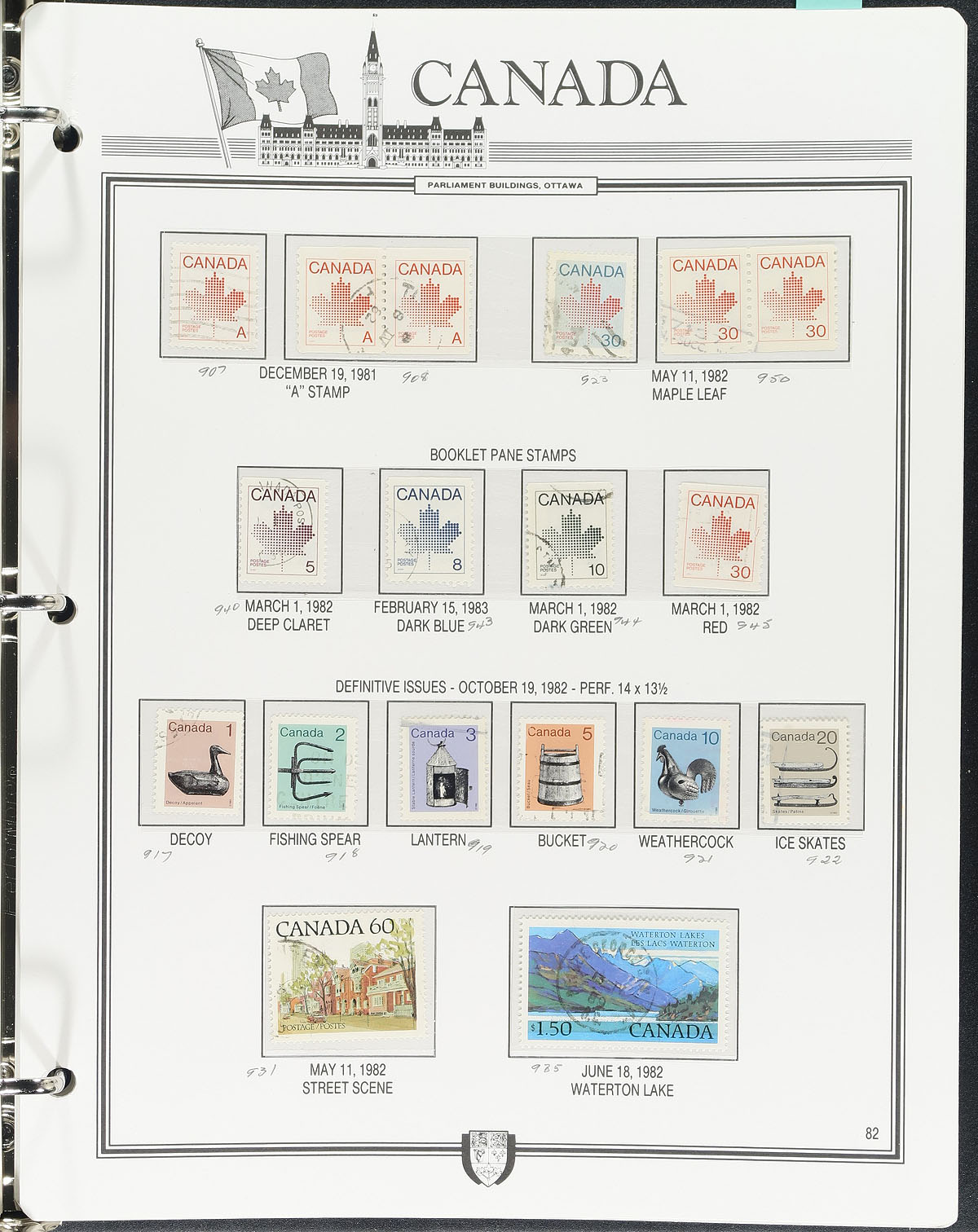 Well organized collection of used Canada in a Unitrade "Canada Junior" album, 1859-1983, containing many hundreds of stamps, primarily in hingeless mounts. The collection generally ranges from Scott #14/1008, containing sets, partial sets, and coil issues noting Scott #s 14-15, 18, 21-22, 25, 29-30, along with 25 Small Queens (10c (x2), 20c and 50c Widow Weeds), partial sets of Leafs and Numerals, complete sets of Edwards, Quebecs, Admirals Scrolls right up to the Peace issues, including coil singles for most classic issues noting #123-124 (c.v. $130 total). Postmark interest includes mostly cds cancels including a few 'socked on the nose' town postmarks. A nice collection that fills the classic area of Canada and should be continued right up to modern day. A few small faults with a few of the early issues, overall fine to very fine. Estimate =
