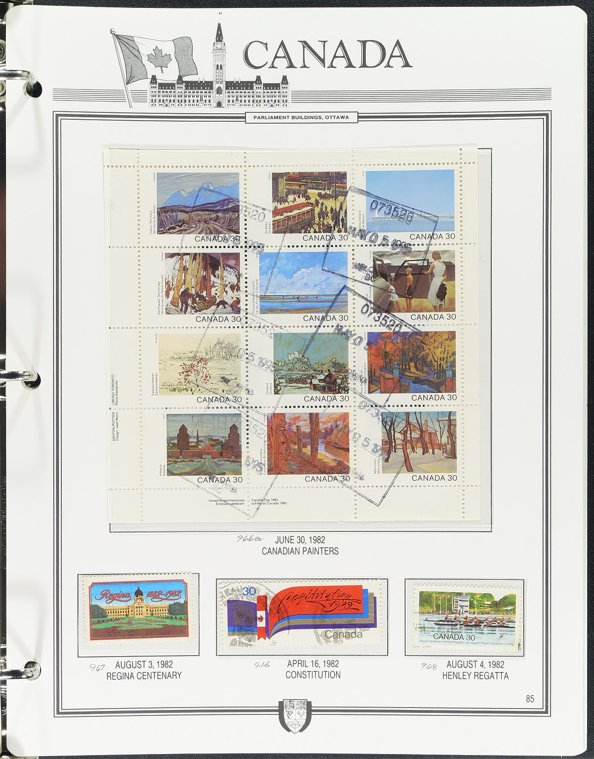 Well organized collection of used Canada in a Unitrade "Canada Junior" album, 1859-1983, containing many hundreds of stamps, primarily in hingeless mounts. The collection generally ranges from Scott #14/1008, containing sets, partial sets, and coil issues noting Scott #s 14-15, 18, 21-22, 25, 29-30, along with 25 Small Queens (10c (x2), 20c and 50c Widow Weeds), partial sets of Leafs and Numerals, complete sets of Edwards, Quebecs, Admirals Scrolls right up to the Peace issues, including coil singles for most classic issues noting #123-124 (c.v. $130 total). Postmark interest includes mostly cds cancels including a few 'socked on the nose' town postmarks. A nice collection that fills the classic area of Canada and should be continued right up to modern day. A few small faults with a few of the early issues, overall fine to very fine. Estimate =