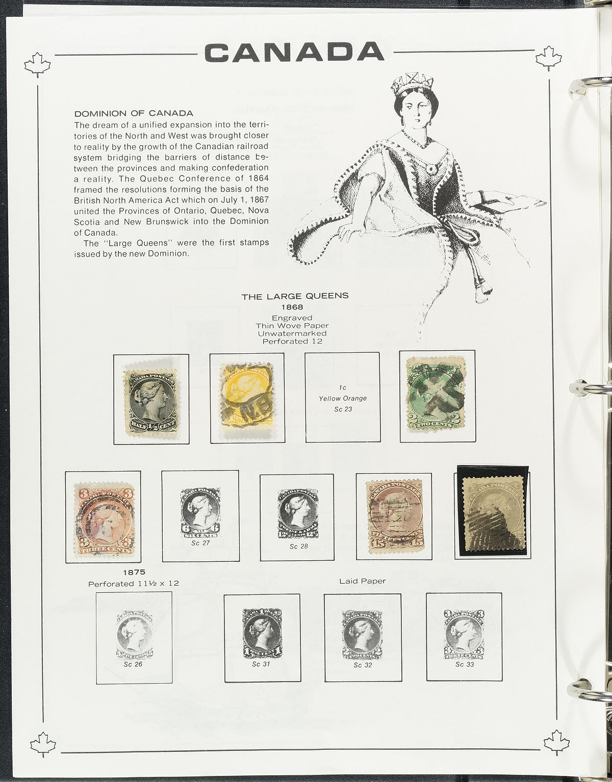 Well organized collection of used Canada in a Unitrade "Canada Junior" album, 1859-1983, containing many hundreds of stamps, primarily in hingeless mounts. The collection generally ranges from Scott #14/1008, containing sets, partial sets, and coil issues noting Scott #s 14-15, 18, 21-22, 25, 29-30, along with 25 Small Queens (10c (x2), 20c and 50c Widow Weeds), partial sets of Leafs and Numerals, complete sets of Edwards, Quebecs, Admirals Scrolls right up to the Peace issues, including coil singles for most classic issues noting #123-124 (c.v. $130 total). Postmark interest includes mostly cds cancels including a few 'socked on the nose' town postmarks. A nice collection that fills the classic area of Canada and should be continued right up to modern day. A few small faults with a few of the early issues, overall fine to very fine. Estimate =