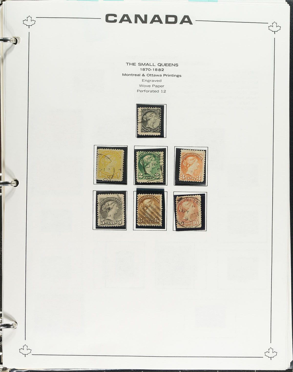 Well organized collection of used Canada in a Unitrade "Canada Junior" album, 1859-1983, containing many hundreds of stamps, primarily in hingeless mounts. The collection generally ranges from Scott #14/1008, containing sets, partial sets, and coil issues noting Scott #s 14-15, 18, 21-22, 25, 29-30, along with 25 Small Queens (10c (x2), 20c and 50c Widow Weeds), partial sets of Leafs and Numerals, complete sets of Edwards, Quebecs, Admirals Scrolls right up to the Peace issues, including coil singles for most classic issues noting #123-124 (c.v. $130 total). Postmark interest includes mostly cds cancels including a few 'socked on the nose' town postmarks. A nice collection that fills the classic area of Canada and should be continued right up to modern day. A few small faults with a few of the early issues, overall fine to very fine. Estimate =
