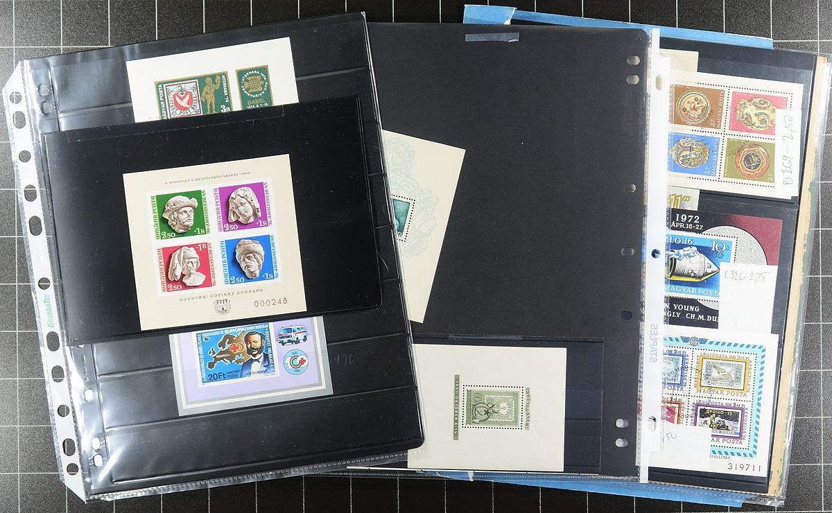 Accumulation of roughly 160 souvenir sheets and sheetlets, 1960's-1990's, nicely arranged in glassines or in stock pages, noting betting representation from Hungary (including a few imperforates), Poland, United Nations, and smaller representation from a few other regions. A spot check indicated some material cataloguing $7 to $30 each, with owner's 2012 Scott catalogue value for the majority of the lot totaling US$1,163.00 ($1570.05 CDN). A nice lot for topical and thematic collectors as we note a wide variety of suitable subjects, and for dealers as a number of items have been identified by Scott number and priced accordingly. Overall fine to very fine. Estimate =