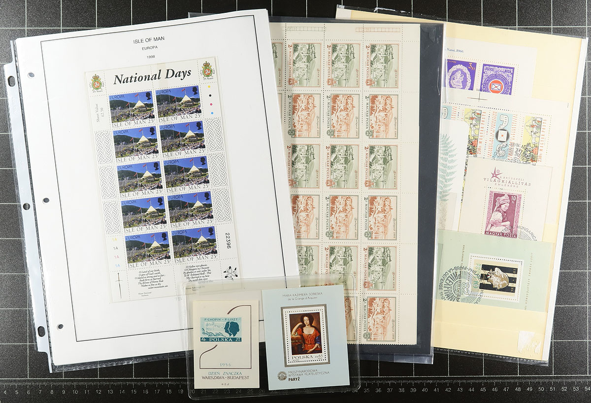 Accumulation of roughly 160 souvenir sheets and sheetlets, 1960's-1990's, nicely arranged in glassines or in stock pages, noting betting representation from Hungary (including a few imperforates), Poland, United Nations, and smaller representation from a few other regions. A spot check indicated some material cataloguing $7 to $30 each, with owner's 2012 Scott catalogue value for the majority of the lot totaling US$1,163.00 ($1570.05 CDN). A nice lot for topical and thematic collectors as we note a wide variety of suitable subjects, and for dealers as a number of items have been identified by Scott number and priced accordingly. Overall fine to very fine. Estimate =