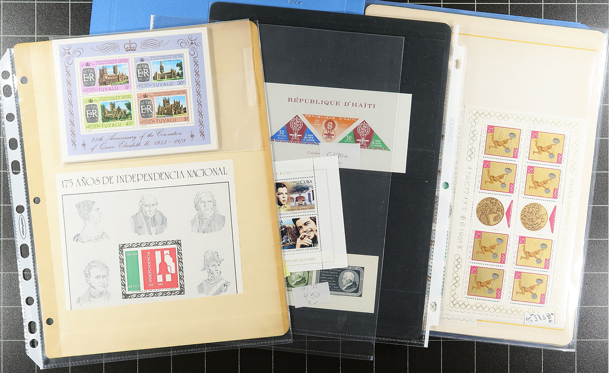 Accumulation of roughly 160 souvenir sheets and sheetlets, 1960's-1990's, nicely arranged in glassines or in stock pages, noting betting representation from Hungary (including a few imperforates), Poland, United Nations, and smaller representation from a few other regions. A spot check indicated some material cataloguing $7 to $30 each, with owner's 2012 Scott catalogue value for the majority of the lot totaling US$1,163.00 ($1570.05 CDN). A nice lot for topical and thematic collectors as we note a wide variety of suitable subjects, and for dealers as a number of items have been identified by Scott number and priced accordingly. Overall fine to very fine. Estimate =