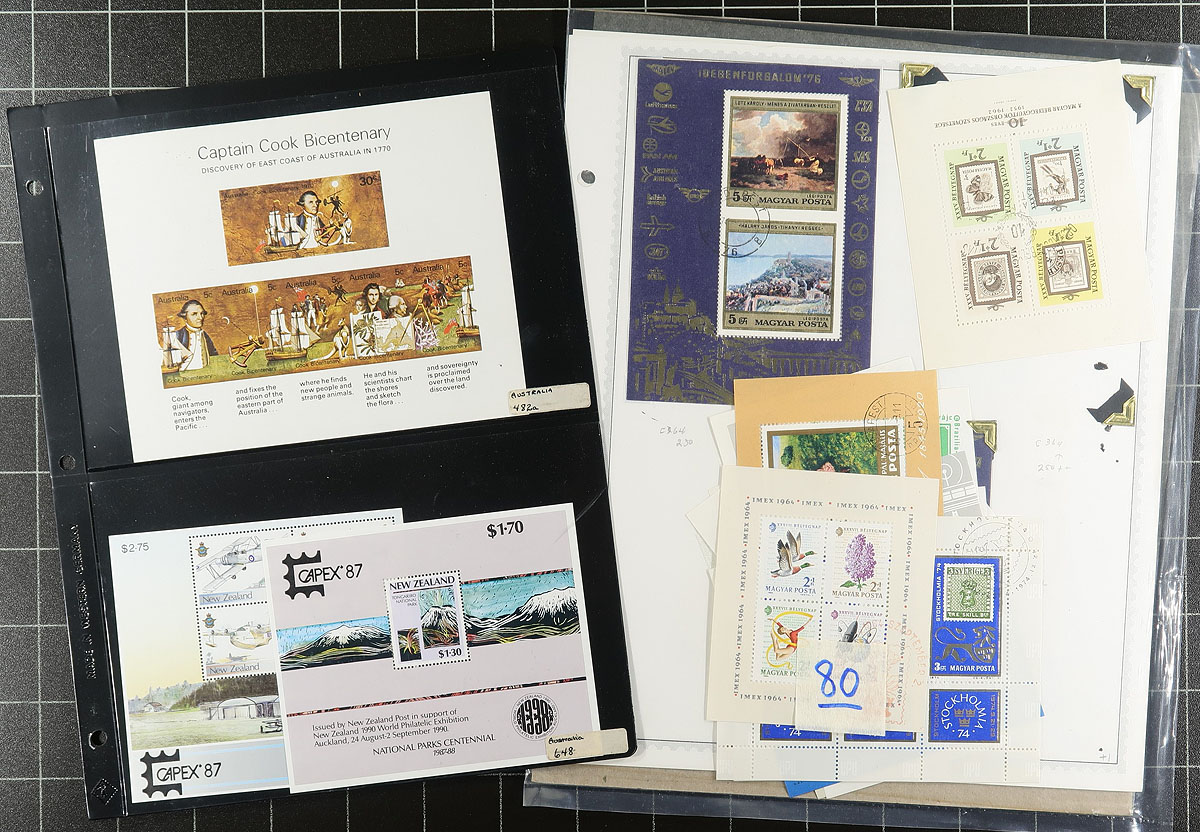 Accumulation of roughly 160 souvenir sheets and sheetlets, 1960's-1990's, nicely arranged in glassines or in stock pages, noting betting representation from Hungary (including a few imperforates), Poland, United Nations, and smaller representation from a few other regions. A spot check indicated some material cataloguing $7 to $30 each, with owner's 2012 Scott catalogue value for the majority of the lot totaling US$1,163.00 ($1570.05 CDN). A nice lot for topical and thematic collectors as we note a wide variety of suitable subjects, and for dealers as a number of items have been identified by Scott number and priced accordingly. Overall fine to very fine. Estimate =