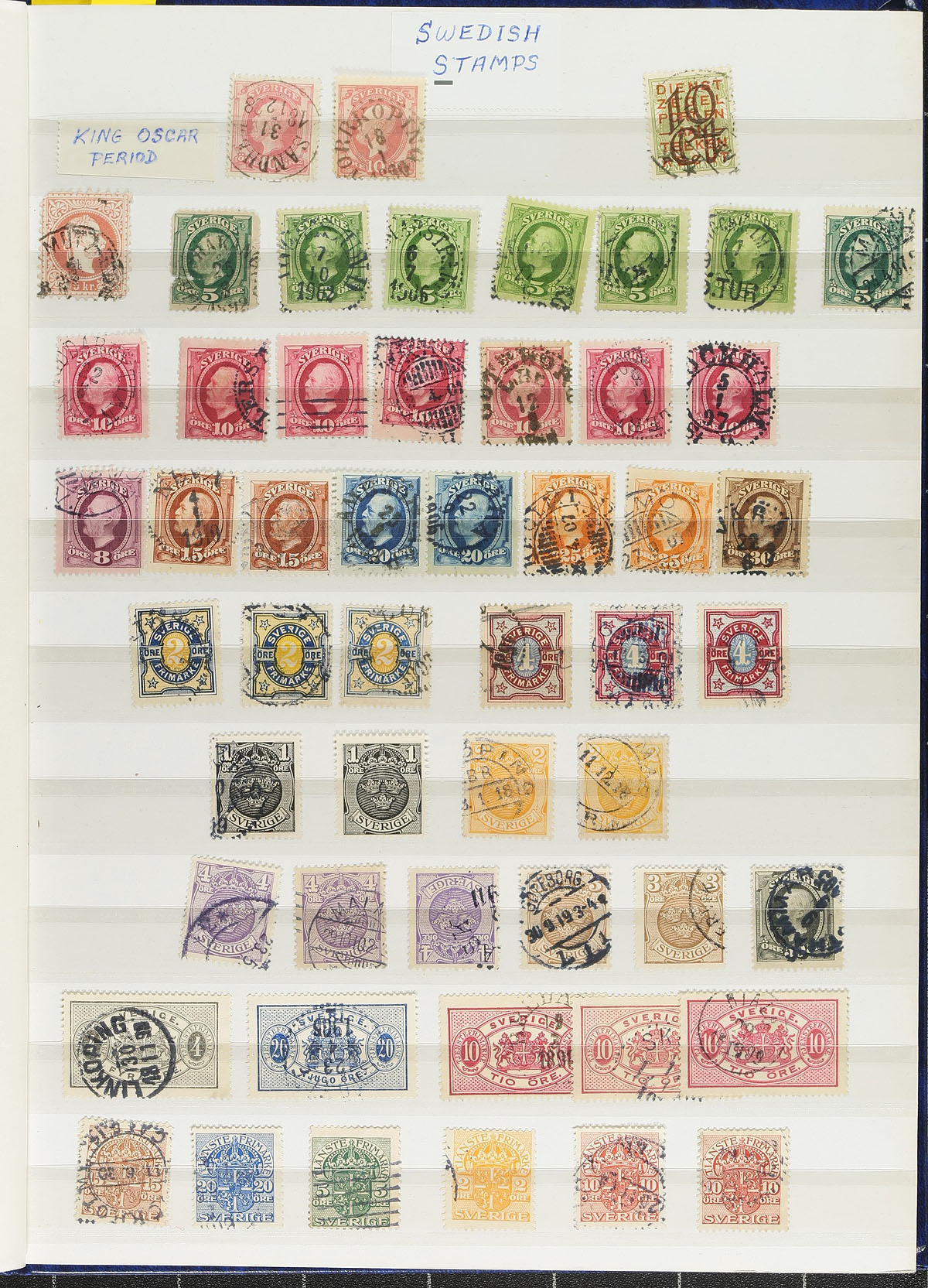 Stock of used Sweden, 1858-2011, containing over 2,600 stamps in two stockbooks and a few stock pages. The lot generally ranges from Scott #8/2652, including a page of Christmas Seals, with strength from the 1890s to the 1950s. A spot check indicated a few items cataloguing $10 and up, with the owner's 2011 Scott catalogue value for the lot totaling US$1,012.00 ($1366.20 CDN). A good lot for potential town cancels, with duplication up to 10 or more for some issues. A few small faults with a few stamps, overall fine to very fine. Estimate =