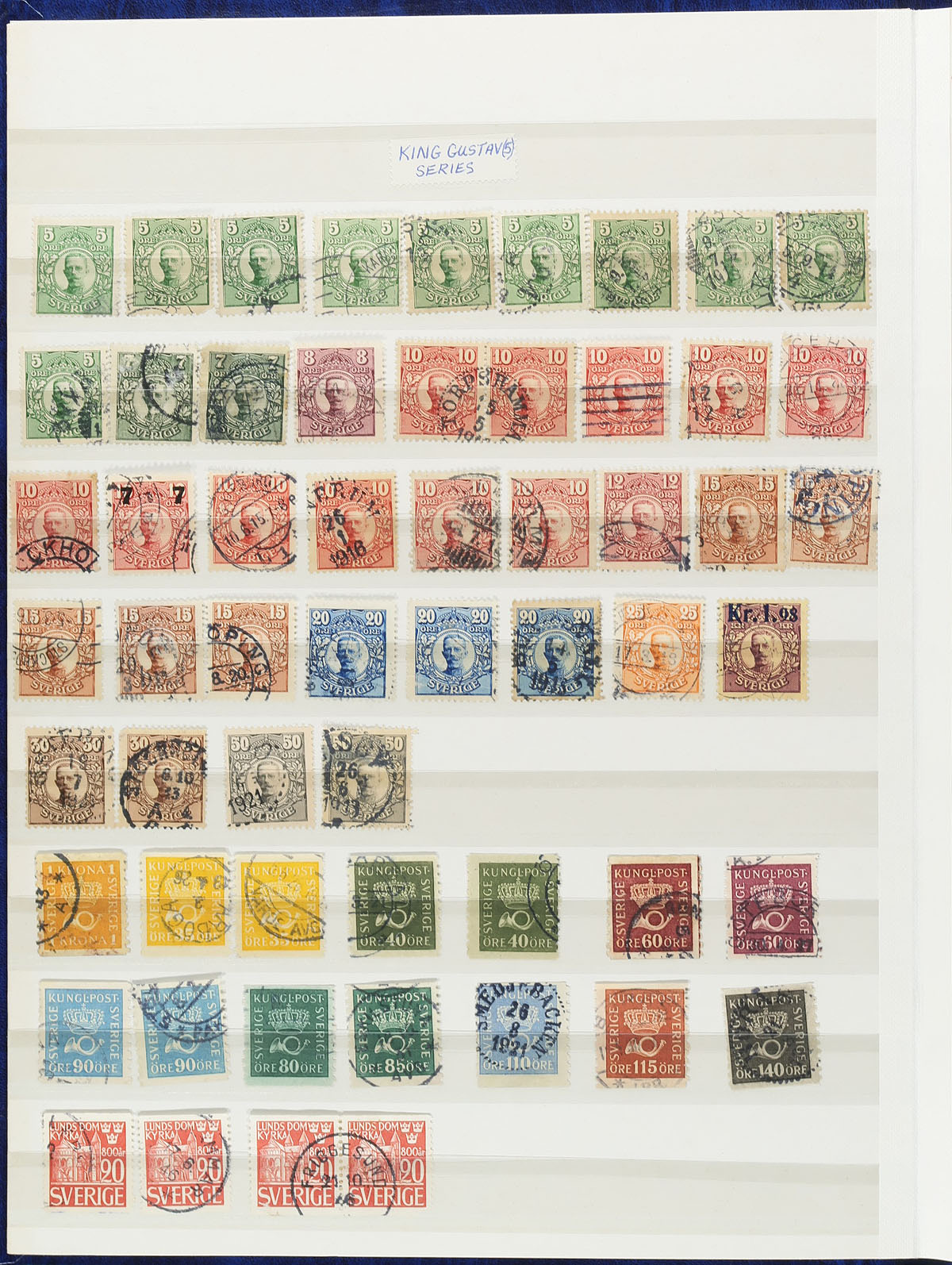 Stock of used Sweden, 1858-2011, containing over 2,600 stamps in two stockbooks and a few stock pages. The lot generally ranges from Scott #8/2652, including a page of Christmas Seals, with strength from the 1890s to the 1950s. A spot check indicated a few items cataloguing $10 and up, with the owner's 2011 Scott catalogue value for the lot totaling US$1,012.00 ($1366.20 CDN). A good lot for potential town cancels, with duplication up to 10 or more for some issues. A few small faults with a few stamps, overall fine to very fine. Estimate =