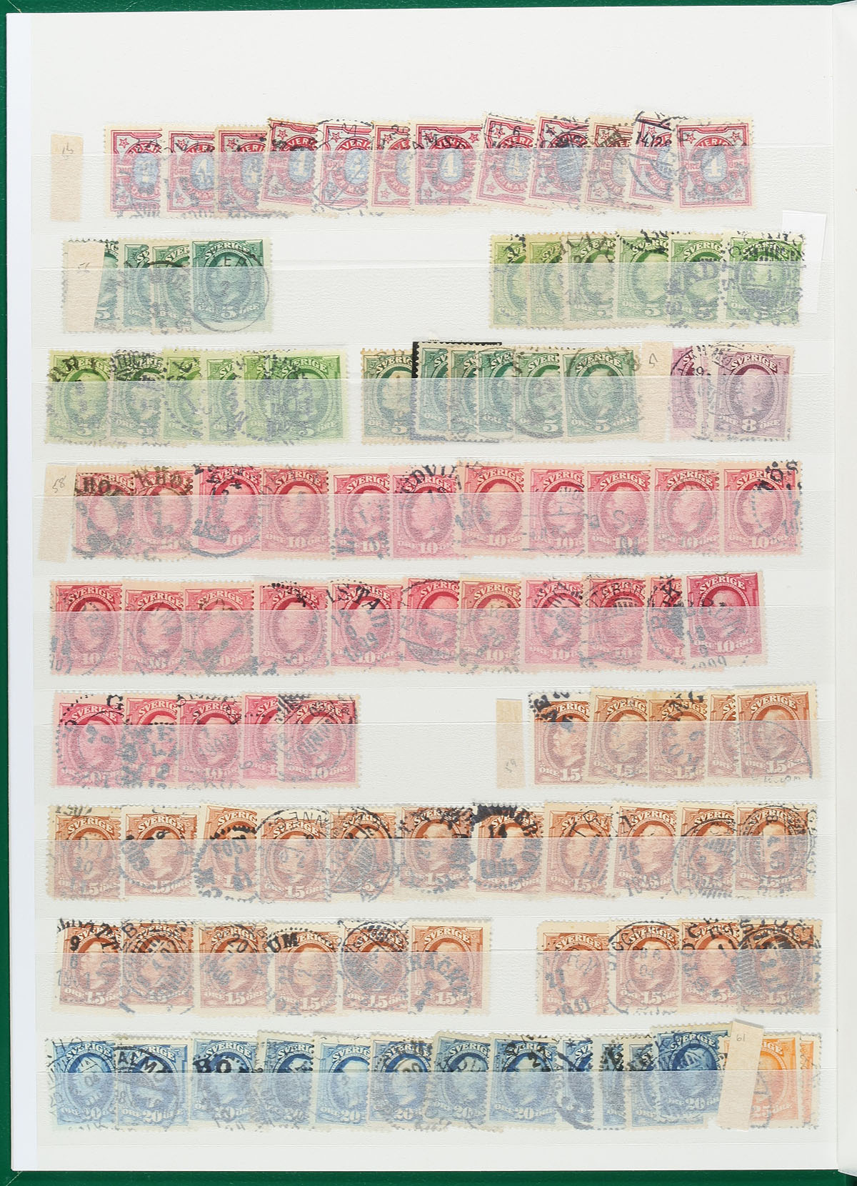 Stock of used Sweden, 1858-2011, containing over 2,600 stamps in two stockbooks and a few stock pages. The lot generally ranges from Scott #8/2652, including a page of Christmas Seals, with strength from the 1890s to the 1950s. A spot check indicated a few items cataloguing $10 and up, with the owner's 2011 Scott catalogue value for the lot totaling US$1,012.00 ($1366.20 CDN). A good lot for potential town cancels, with duplication up to 10 or more for some issues. A few small faults with a few stamps, overall fine to very fine. Estimate =