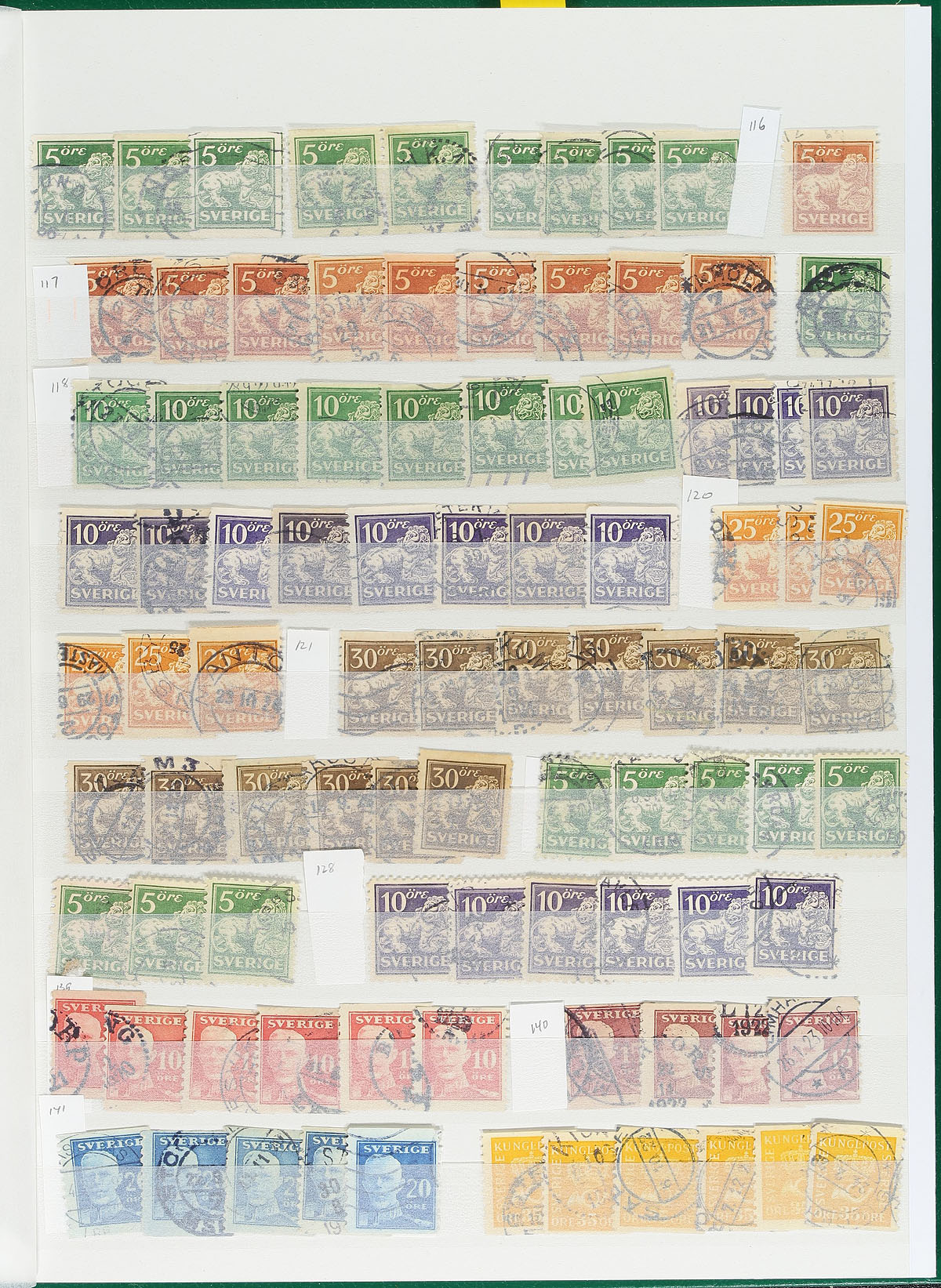 Stock of used Sweden, 1858-2011, containing over 2,600 stamps in two stockbooks and a few stock pages. The lot generally ranges from Scott #8/2652, including a page of Christmas Seals, with strength from the 1890s to the 1950s. A spot check indicated a few items cataloguing $10 and up, with the owner's 2011 Scott catalogue value for the lot totaling US$1,012.00 ($1366.20 CDN). A good lot for potential town cancels, with duplication up to 10 or more for some issues. A few small faults with a few stamps, overall fine to very fine. Estimate =