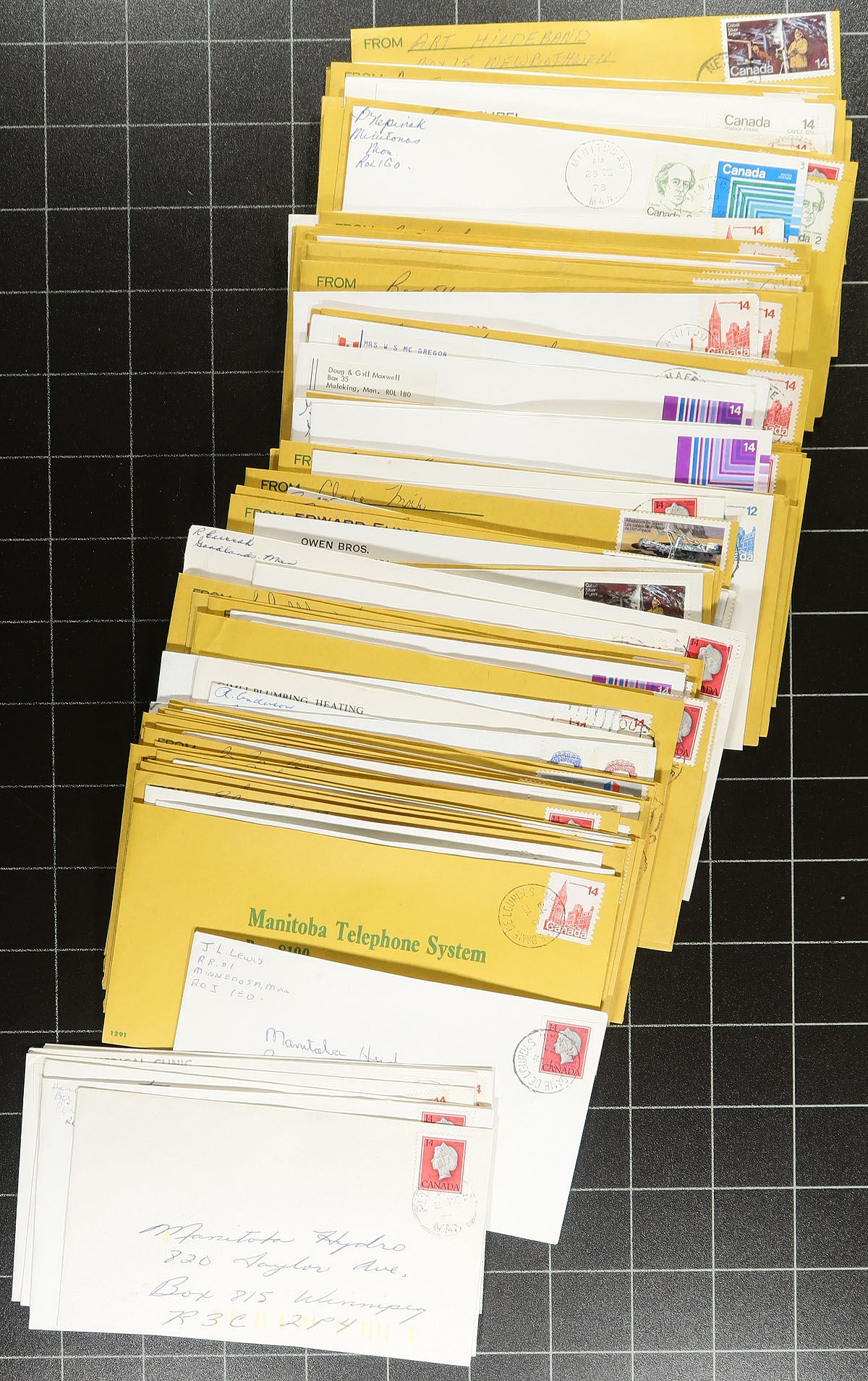 Manitoba Postmarks. Accumulation of roughly 550 covers collected for Manitoba town postmarks. A cursory check indicated a few hundred different towns ranging from A to W, the vast majority being a correspondence to the Manitoba Telephone System or Manitoba Hydro from 1978. Just a few of the towns encountered include Seven Sisters Falls, Rapid City, Pine Falls, Snow Lake, Sprague, Gladstone, Falcon Beach, Fisher Branch, Fork River, and more, with some towns having different postmark types or frankings. Some of the postmarks include cds, duplex, and POCON types. A nice lot for the Manitoba or Canada postmark collector, with some duplication within, overall fine to very fine. Estimate =
