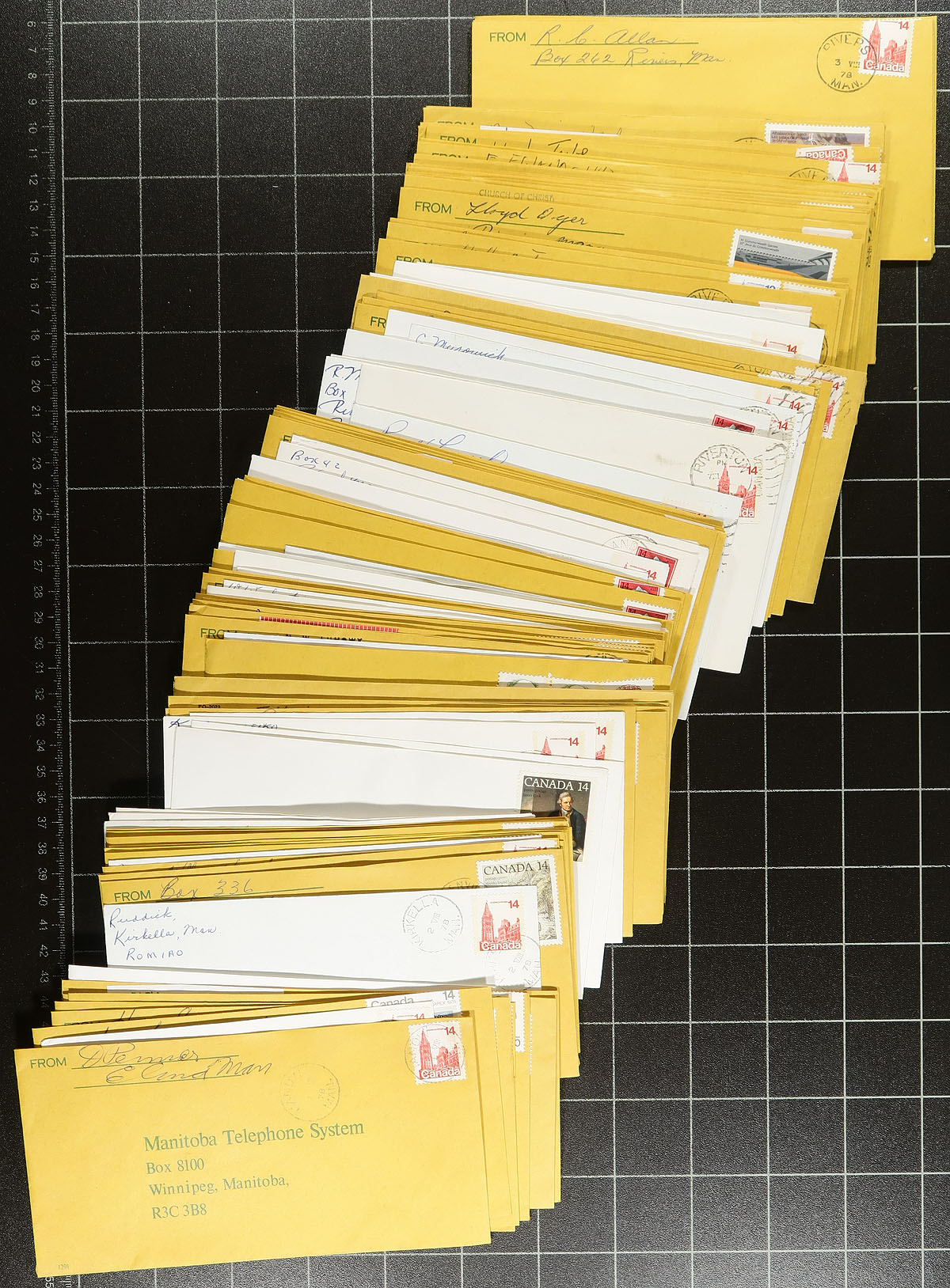 Manitoba Postmarks. Accumulation of roughly 550 covers collected for Manitoba town postmarks. A cursory check indicated a few hundred different towns ranging from A to W, the vast majority being a correspondence to the Manitoba Telephone System or Manitoba Hydro from 1978. Just a few of the towns encountered include Seven Sisters Falls, Rapid City, Pine Falls, Snow Lake, Sprague, Gladstone, Falcon Beach, Fisher Branch, Fork River, and more, with some towns having different postmark types or frankings. Some of the postmarks include cds, duplex, and POCON types. A nice lot for the Manitoba or Canada postmark collector, with some duplication within, overall fine to very fine. Estimate =