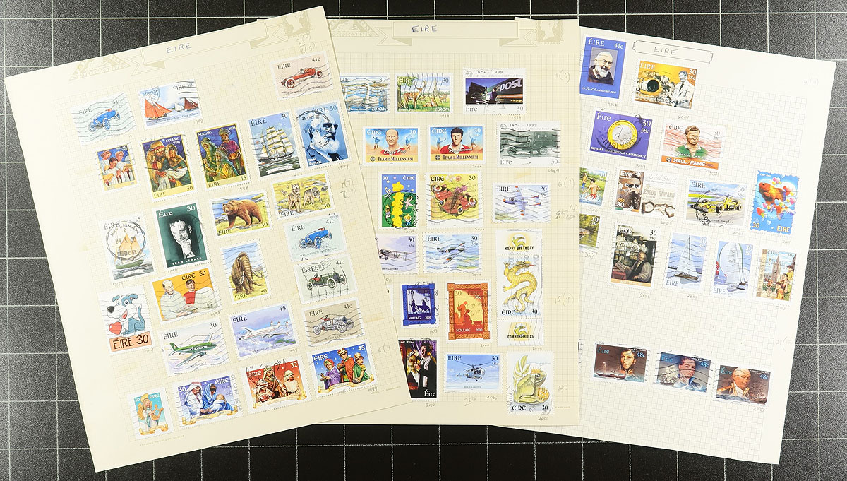 Accumulation of used Ireland, 1922-2009, containing roughly 1,500 stamps in roughly 30 album or stock pages. The lot generally ranges from Scott #1/1831, including back of the book issues, noting singles and sets cataloguing in the $10 range and up, including the popular bird set from the late 1990's to the early 2000's. Owner's 2011 Scott value for the lot totals US$1,391.00 ($1877.00 CDN), leaving better finds for the dedicated collector. A few small faults with a few of the stamps, with mild duplication for most issues throughout, overall fine to very fine. Estimate =