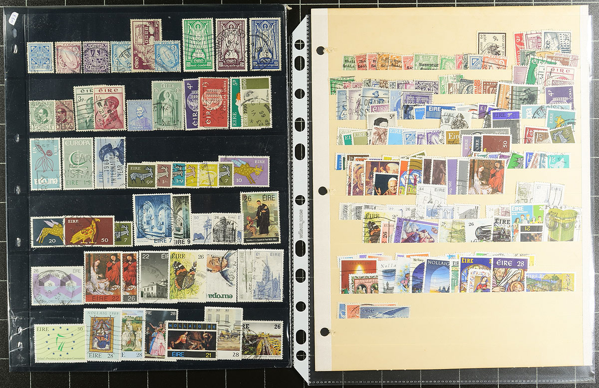 Accumulation of used Ireland, 1922-2009, containing roughly 1,500 stamps in roughly 30 album or stock pages. The lot generally ranges from Scott #1/1831, including back of the book issues, noting singles and sets cataloguing in the $10 range and up, including the popular bird set from the late 1990's to the early 2000's. Owner's 2011 Scott value for the lot totals US$1,391.00 ($1877.00 CDN), leaving better finds for the dedicated collector. A few small faults with a few of the stamps, with mild duplication for most issues throughout, overall fine to very fine. Estimate =