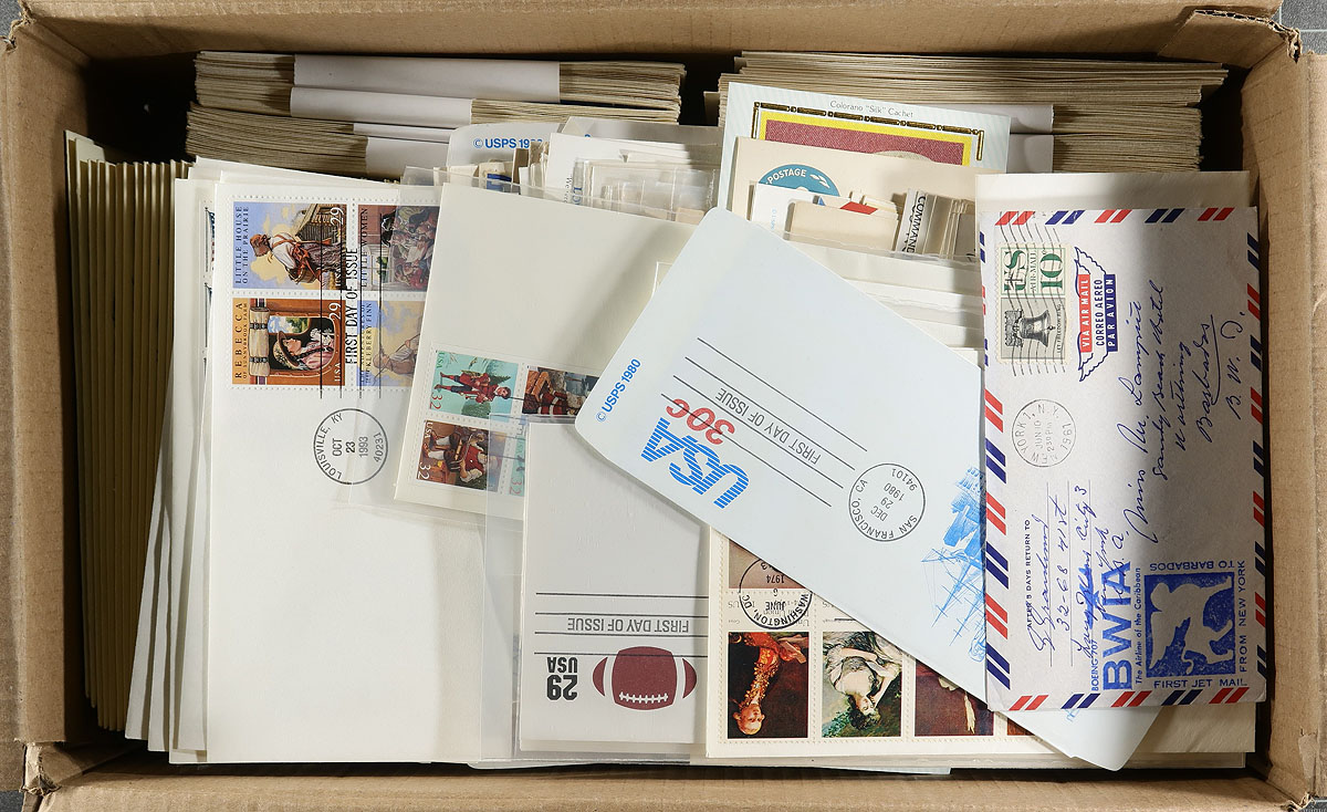 Collection of roughly 450 covers, 1970's-1990's, containing primarily first day covers along with commemorative and event covers, with singles, sets, booklet panes, souvenir sheets, and high denomination frankings, noting many Art Craft and Fleetwood cachets. A nice clean lot for collectors (especially topical and thematic), and for dealers looking to fill out dollar boxes. Estimate =