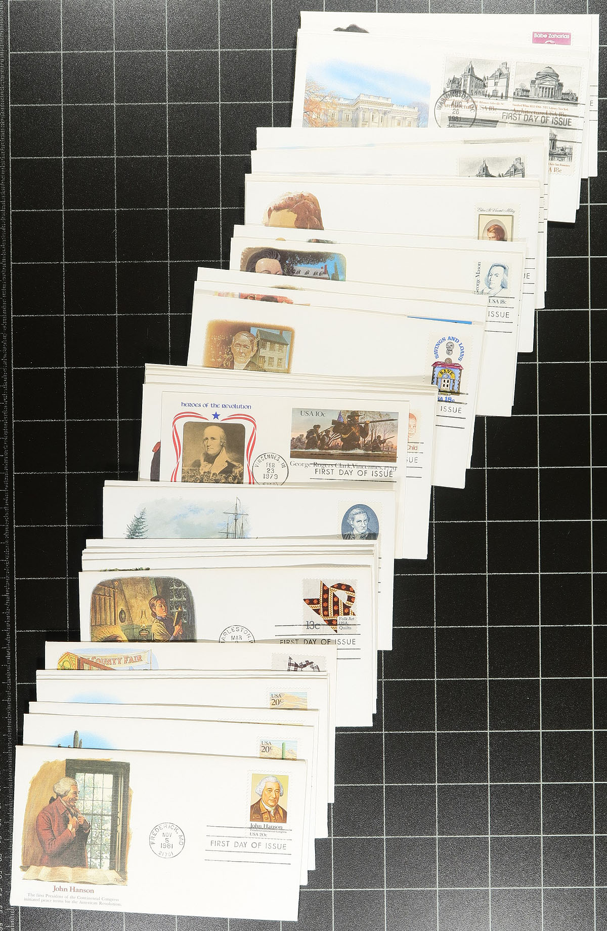Collection of roughly 450 covers, 1970's-1990's, containing primarily first day covers along with commemorative and event covers, with singles, sets, booklet panes, souvenir sheets, and high denomination frankings, noting many Art Craft and Fleetwood cachets. A nice clean lot for collectors (especially topical and thematic), and for dealers looking to fill out dollar boxes. Estimate =