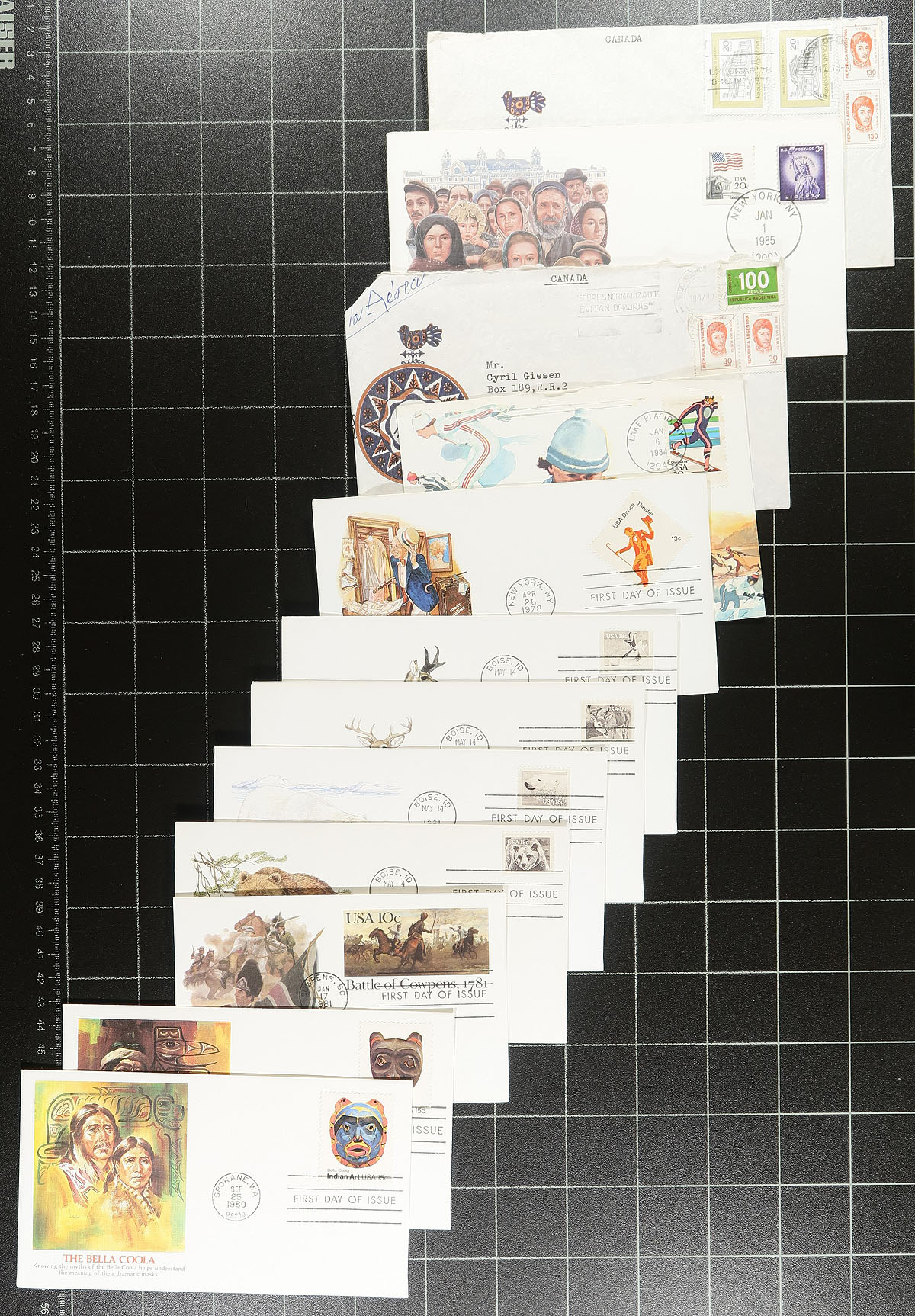 Collection of roughly 450 covers, 1970's-1990's, containing primarily first day covers along with commemorative and event covers, with singles, sets, booklet panes, souvenir sheets, and high denomination frankings, noting many Art Craft and Fleetwood cachets. A nice clean lot for collectors (especially topical and thematic), and for dealers looking to fill out dollar boxes. Estimate =