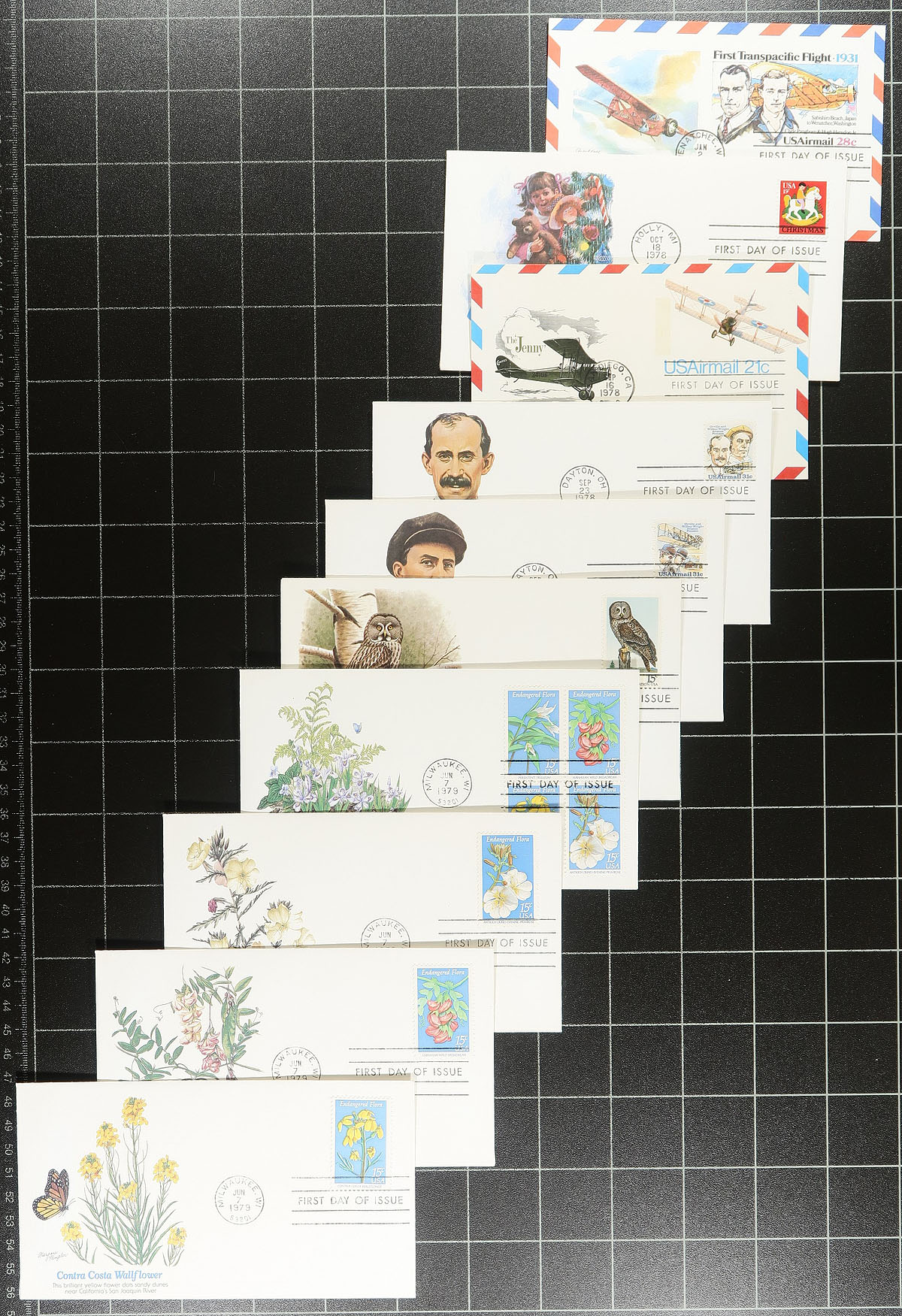 Collection of roughly 450 covers, 1970's-1990's, containing primarily first day covers along with commemorative and event covers, with singles, sets, booklet panes, souvenir sheets, and high denomination frankings, noting many Art Craft and Fleetwood cachets. A nice clean lot for collectors (especially topical and thematic), and for dealers looking to fill out dollar boxes. Estimate =