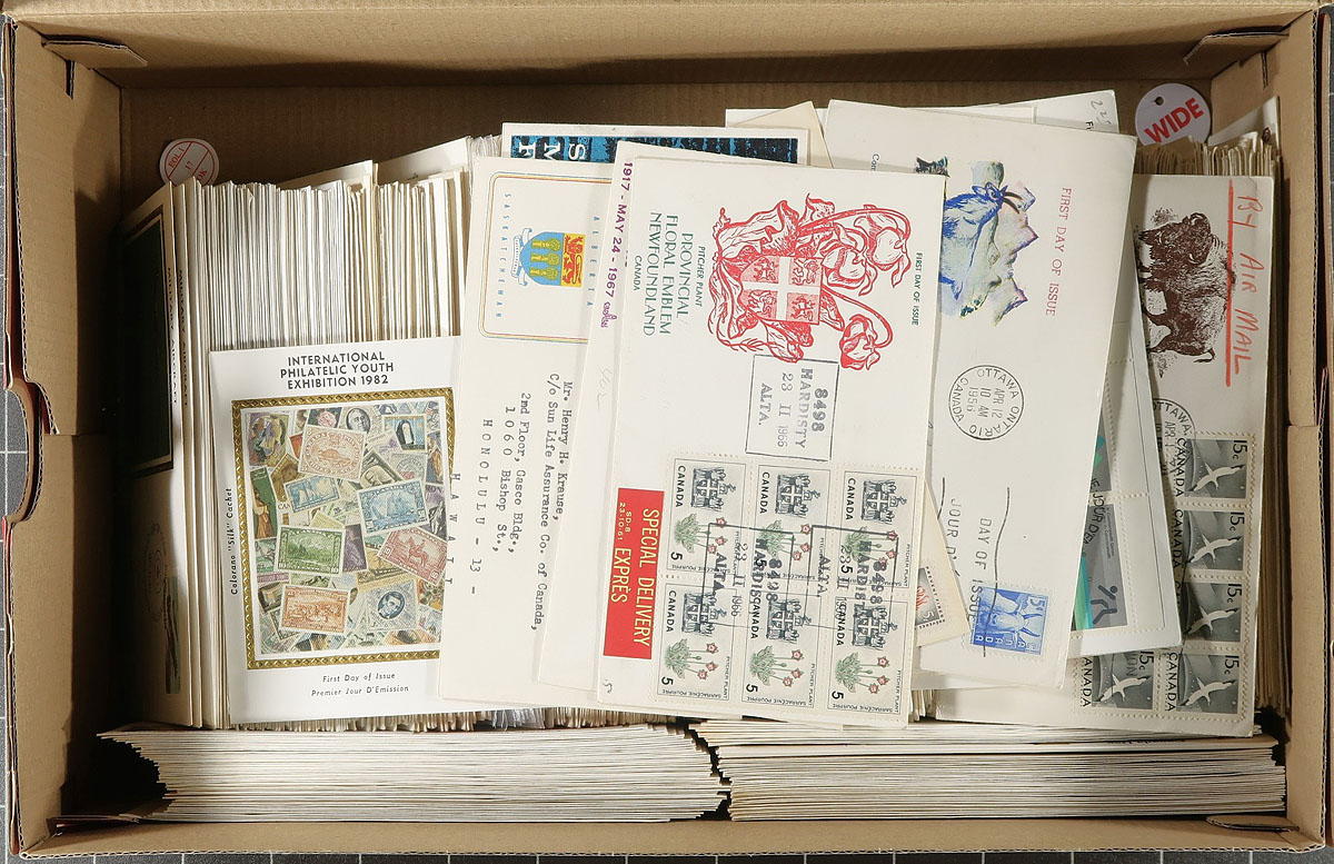 First Day Covers. Lovely group of roughly 400 private cachet first day covers, 1950's-1983, loose in a box, noting mostly single frankings along with a few other types. The earlier covers have cachets from makers Caneco, Cole, JCR, Cole. Rose Craft, Capital, with modern cachets from NR and Colorano silks. A lovely lot ideal for collectors and dealers alike. Estimate =