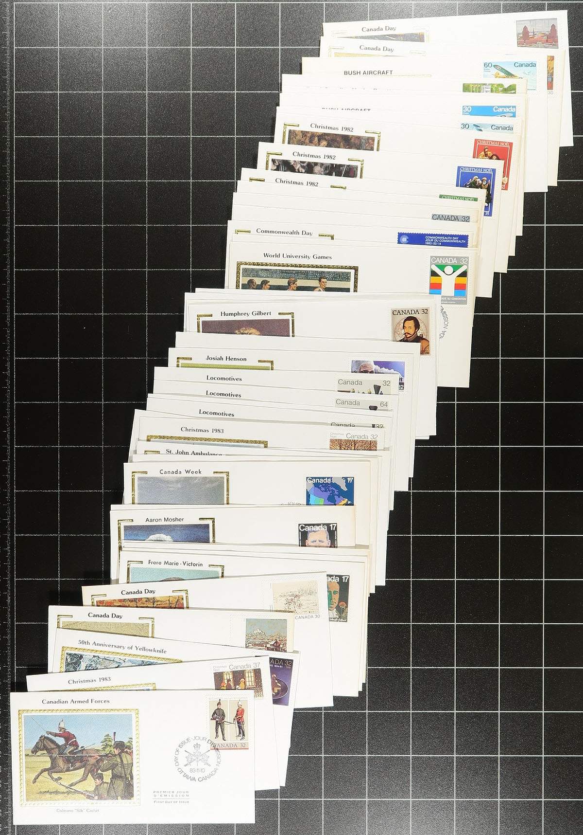 First Day Covers. Lovely group of roughly 400 private cachet first day covers, 1950's-1983, loose in a box, noting mostly single frankings along with a few other types. The earlier covers have cachets from makers Caneco, Cole, JCR, Cole. Rose Craft, Capital, with modern cachets from NR and Colorano silks. A lovely lot ideal for collectors and dealers alike. Estimate =