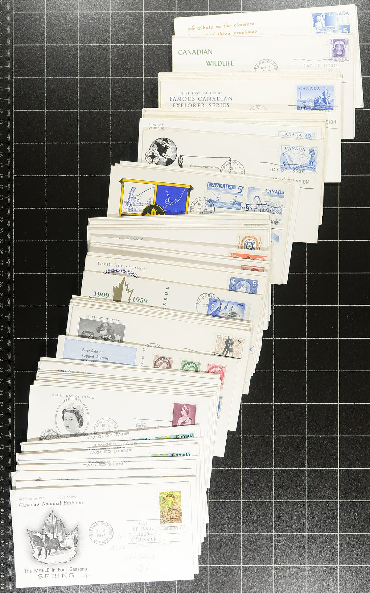 First Day Covers. Lovely group of roughly 400 private cachet first day covers, 1950's-1983, loose in a box, noting mostly single frankings along with a few other types. The earlier covers have cachets from makers Caneco, Cole, JCR, Cole. Rose Craft, Capital, with modern cachets from NR and Colorano silks. A lovely lot ideal for collectors and dealers alike. Estimate =