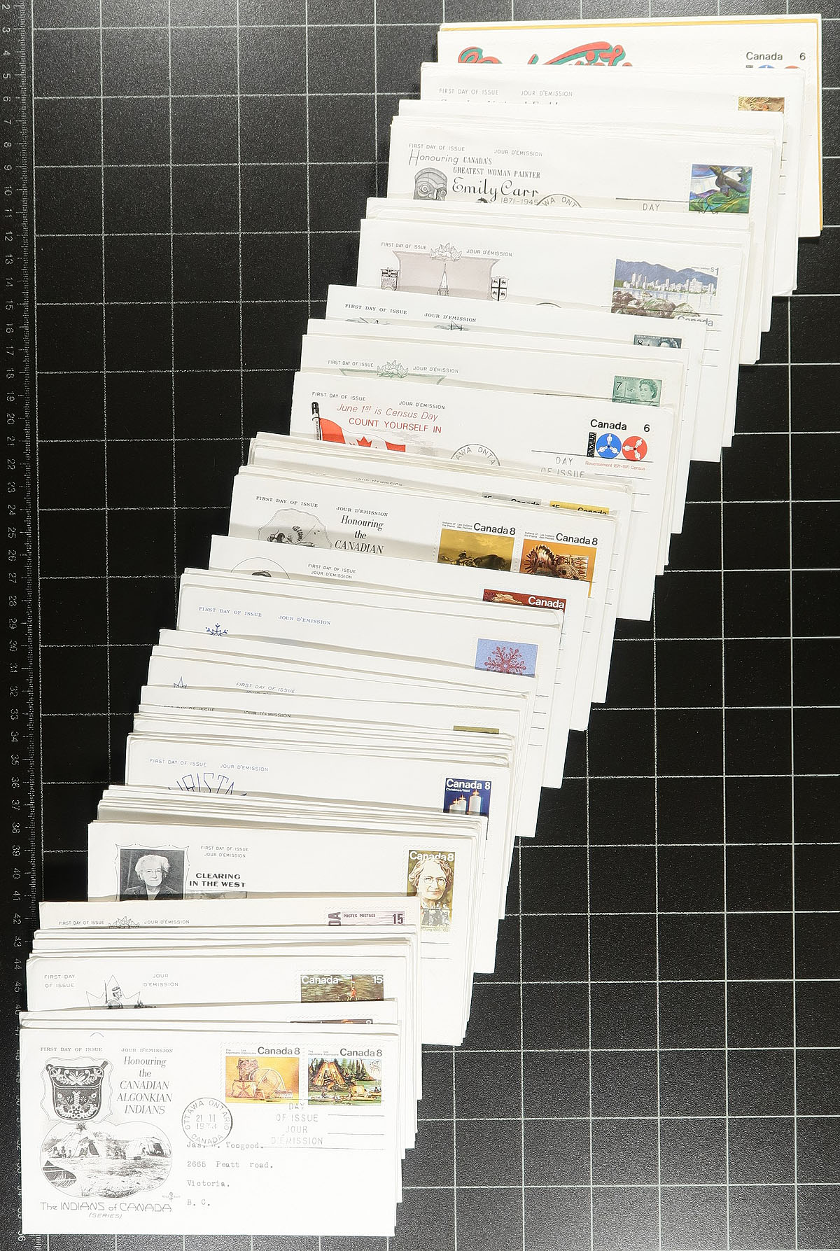 First Day Covers. Lovely group of roughly 400 private cachet first day covers, 1950's-1983, loose in a box, noting mostly single frankings along with a few other types. The earlier covers have cachets from makers Caneco, Cole, JCR, Cole. Rose Craft, Capital, with modern cachets from NR and Colorano silks. A lovely lot ideal for collectors and dealers alike. Estimate =