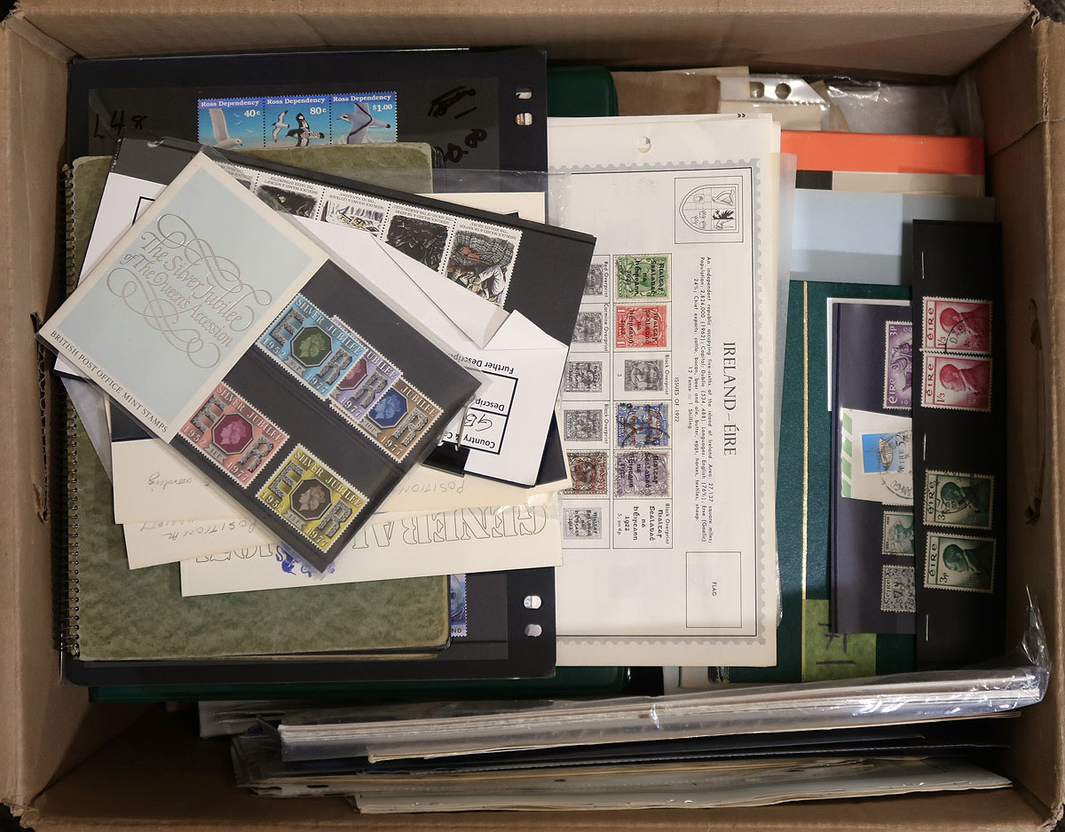Carton full of thousands of worldwide stamps in a variety of formats including stock and album pages, a few sparsely filled albums, glassines, loose material in boxes, etc. It appears the majority of material ranges from the 1930's onwards noting better representation from Ireland, New Zealand, Switzerland, just to name a few, making this a nice project for the worldwide sorter and collector. A who knows what one will find lot. Estimate =