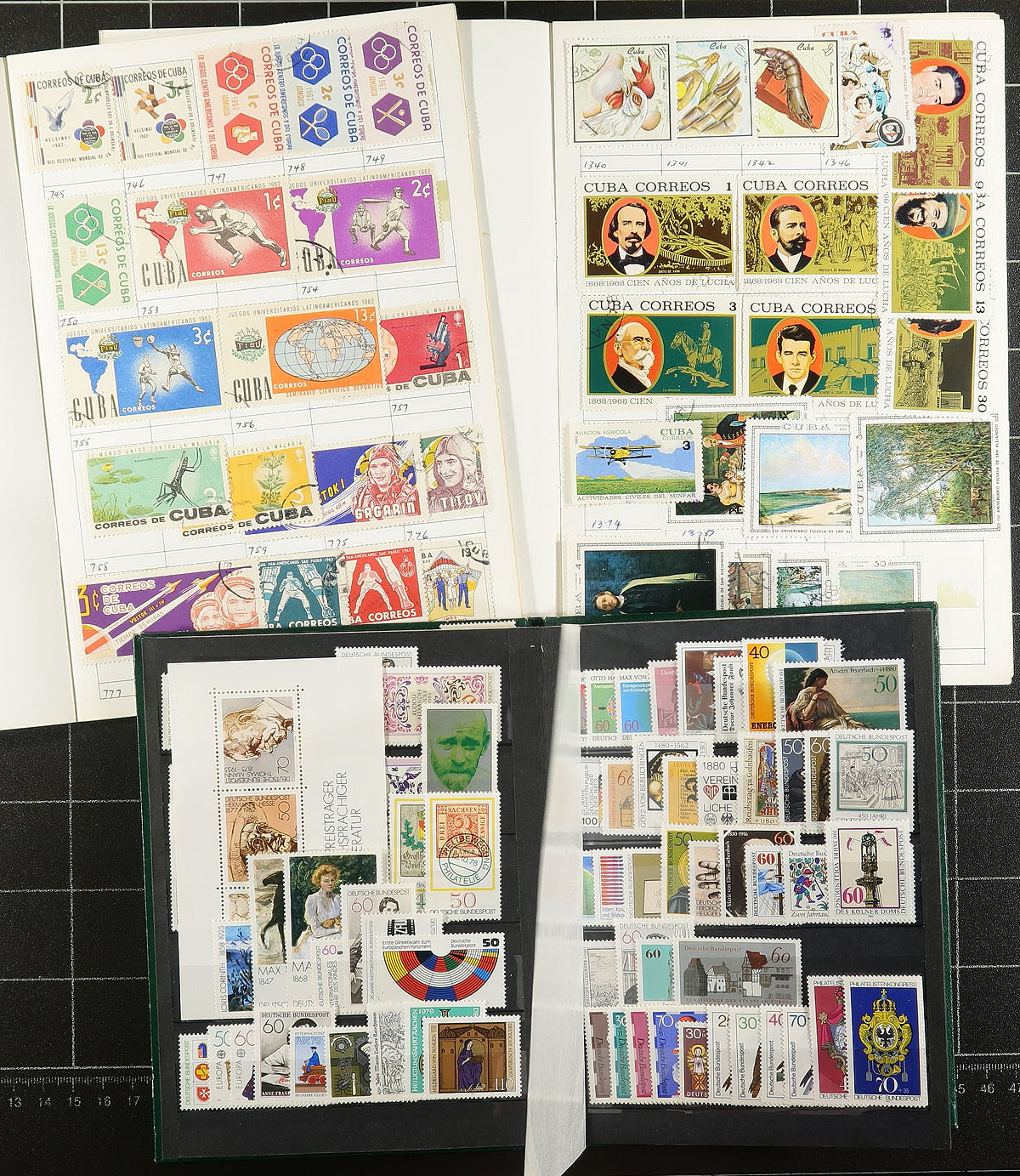 Carton full of thousands of worldwide stamps in a variety of formats including stock and album pages, a few sparsely filled albums, glassines, loose material in boxes, etc. It appears the majority of material ranges from the 1930's onwards noting better representation from Ireland, New Zealand, Switzerland, just to name a few, making this a nice project for the worldwide sorter and collector. A who knows what one will find lot. Estimate =