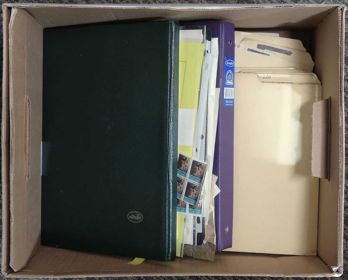 Accumulation of used Canada in a variety of formats, 1890's-1980's, containing a probable few thousand stamps, in several album pages, manila or stock pages, a stockbook, glassines, etc. A very quick check indicated some classic material, including a stockbook of used Admirals (roughly 150 in total), along with a few modern used booklet panes, souvenir sheets, and more. Postmark interest includes cds, duplex, modern postmarks, noting several 'socked on the nose' town cancels. Thorough investigation could yield better finds by the dedicated collector. Estimate =