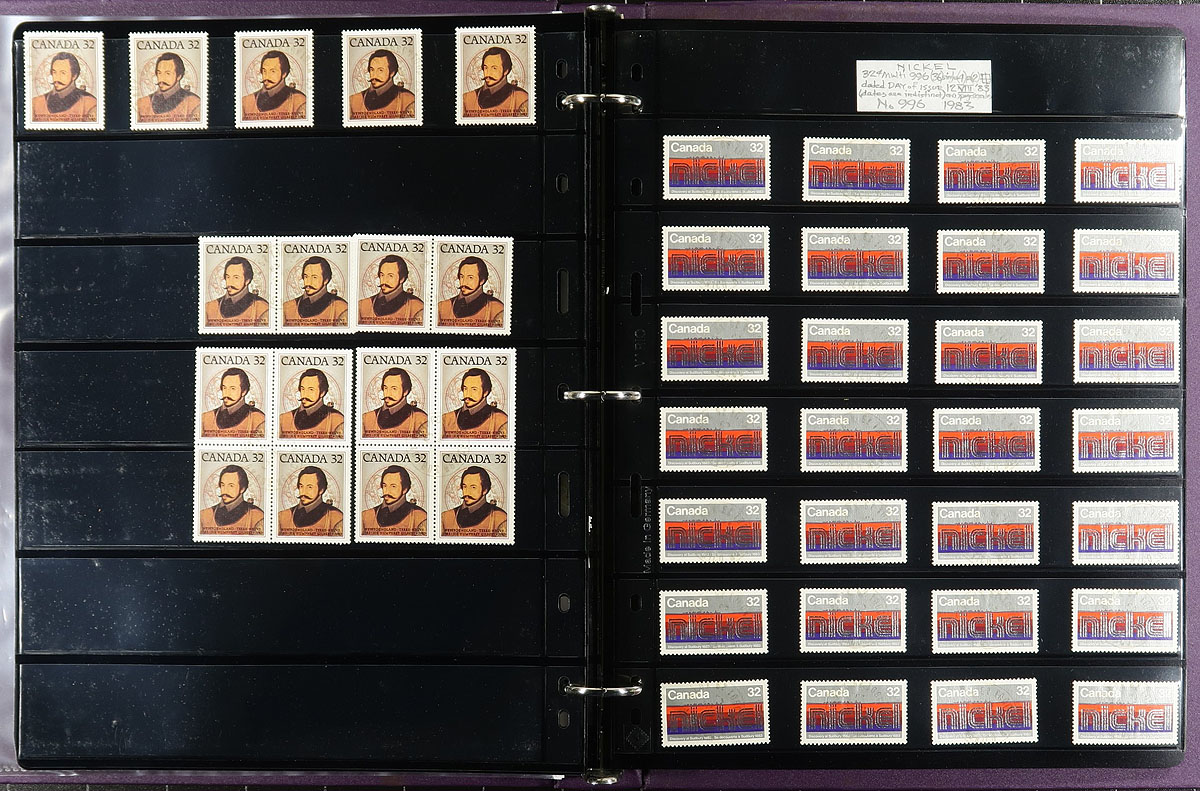 Accumulation of used Canada in a variety of formats, 1890's-1980's, containing a probable few thousand stamps, in several album pages, manila or stock pages, a stockbook, glassines, etc. A very quick check indicated some classic material, including a stockbook of used Admirals (roughly 150 in total), along with a few modern used booklet panes, souvenir sheets, and more. Postmark interest includes cds, duplex, modern postmarks, noting several 'socked on the nose' town cancels. Thorough investigation could yield better finds by the dedicated collector. Estimate =