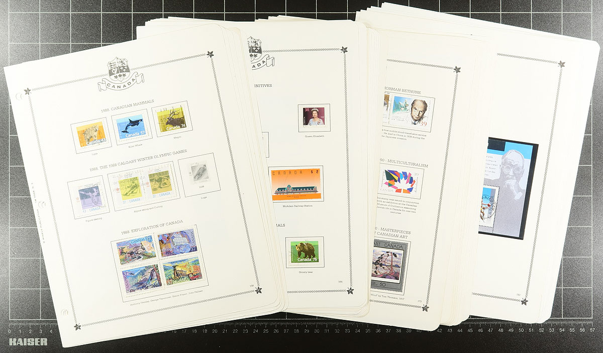 Accumulation of used Canada in a variety of formats, 1890's-1980's, containing a probable few thousand stamps, in several album pages, manila or stock pages, a stockbook, glassines, etc. A very quick check indicated some classic material, including a stockbook of used Admirals (roughly 150 in total), along with a few modern used booklet panes, souvenir sheets, and more. Postmark interest includes cds, duplex, modern postmarks, noting several 'socked on the nose' town cancels. Thorough investigation could yield better finds by the dedicated collector. Estimate =
