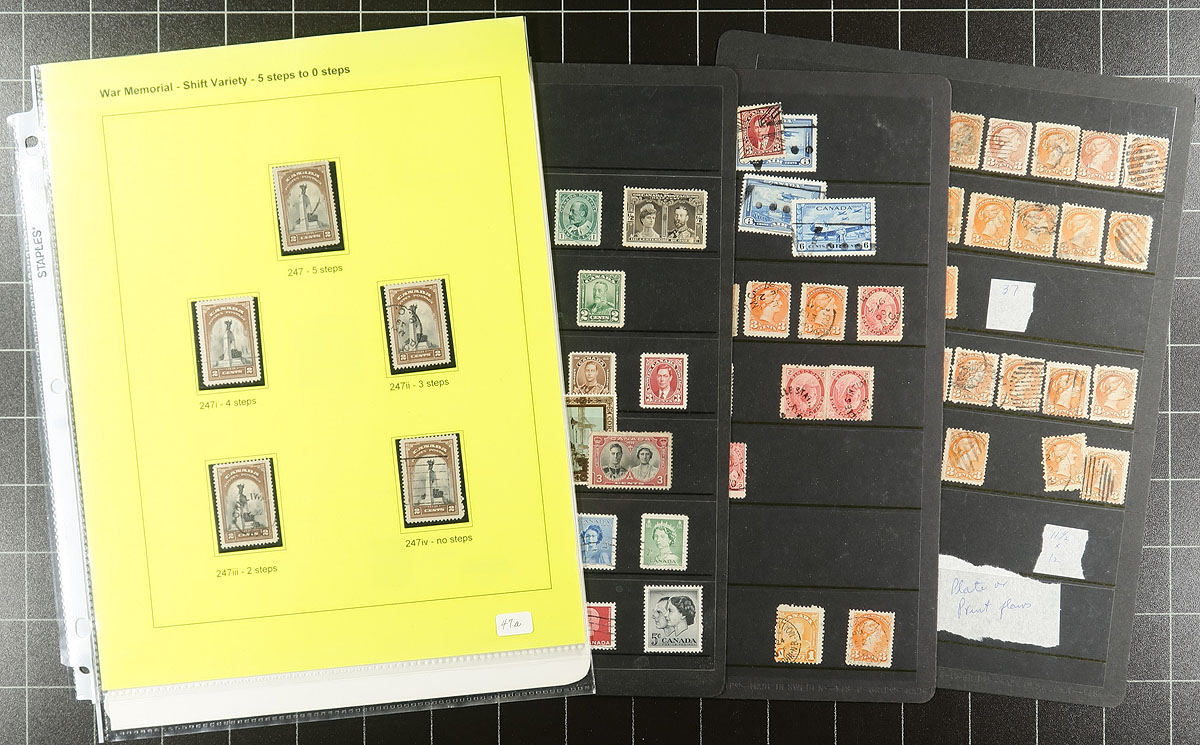 Accumulation of used Canada in a variety of formats, 1890's-1980's, containing a probable few thousand stamps, in several album pages, manila or stock pages, a stockbook, glassines, etc. A very quick check indicated some classic material, including a stockbook of used Admirals (roughly 150 in total), along with a few modern used booklet panes, souvenir sheets, and more. Postmark interest includes cds, duplex, modern postmarks, noting several 'socked on the nose' town cancels. Thorough investigation could yield better finds by the dedicated collector. Estimate =