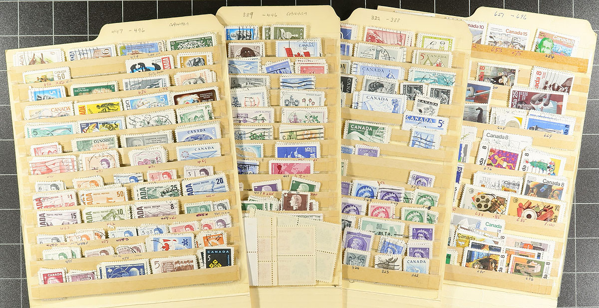 Accumulation of used Canada in a variety of formats, 1890's-1980's, containing a probable few thousand stamps, in several album pages, manila or stock pages, a stockbook, glassines, etc. A very quick check indicated some classic material, including a stockbook of used Admirals (roughly 150 in total), along with a few modern used booklet panes, souvenir sheets, and more. Postmark interest includes cds, duplex, modern postmarks, noting several 'socked on the nose' town cancels. Thorough investigation could yield better finds by the dedicated collector. Estimate =