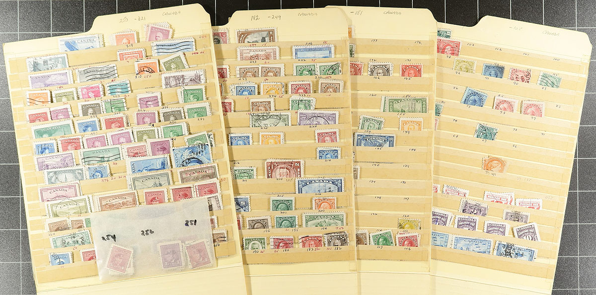 Accumulation of used Canada in a variety of formats, 1890's-1980's, containing a probable few thousand stamps, in several album pages, manila or stock pages, a stockbook, glassines, etc. A very quick check indicated some classic material, including a stockbook of used Admirals (roughly 150 in total), along with a few modern used booklet panes, souvenir sheets, and more. Postmark interest includes cds, duplex, modern postmarks, noting several 'socked on the nose' town cancels. Thorough investigation could yield better finds by the dedicated collector. Estimate =