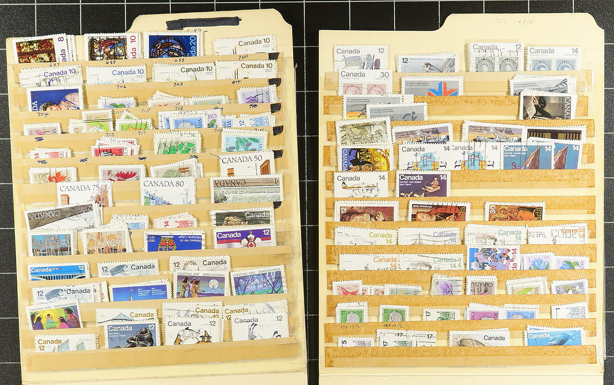 Accumulation of used Canada in a variety of formats, 1890's-1980's, containing a probable few thousand stamps, in several album pages, manila or stock pages, a stockbook, glassines, etc. A very quick check indicated some classic material, including a stockbook of used Admirals (roughly 150 in total), along with a few modern used booklet panes, souvenir sheets, and more. Postmark interest includes cds, duplex, modern postmarks, noting several 'socked on the nose' town cancels. Thorough investigation could yield better finds by the dedicated collector. Estimate =