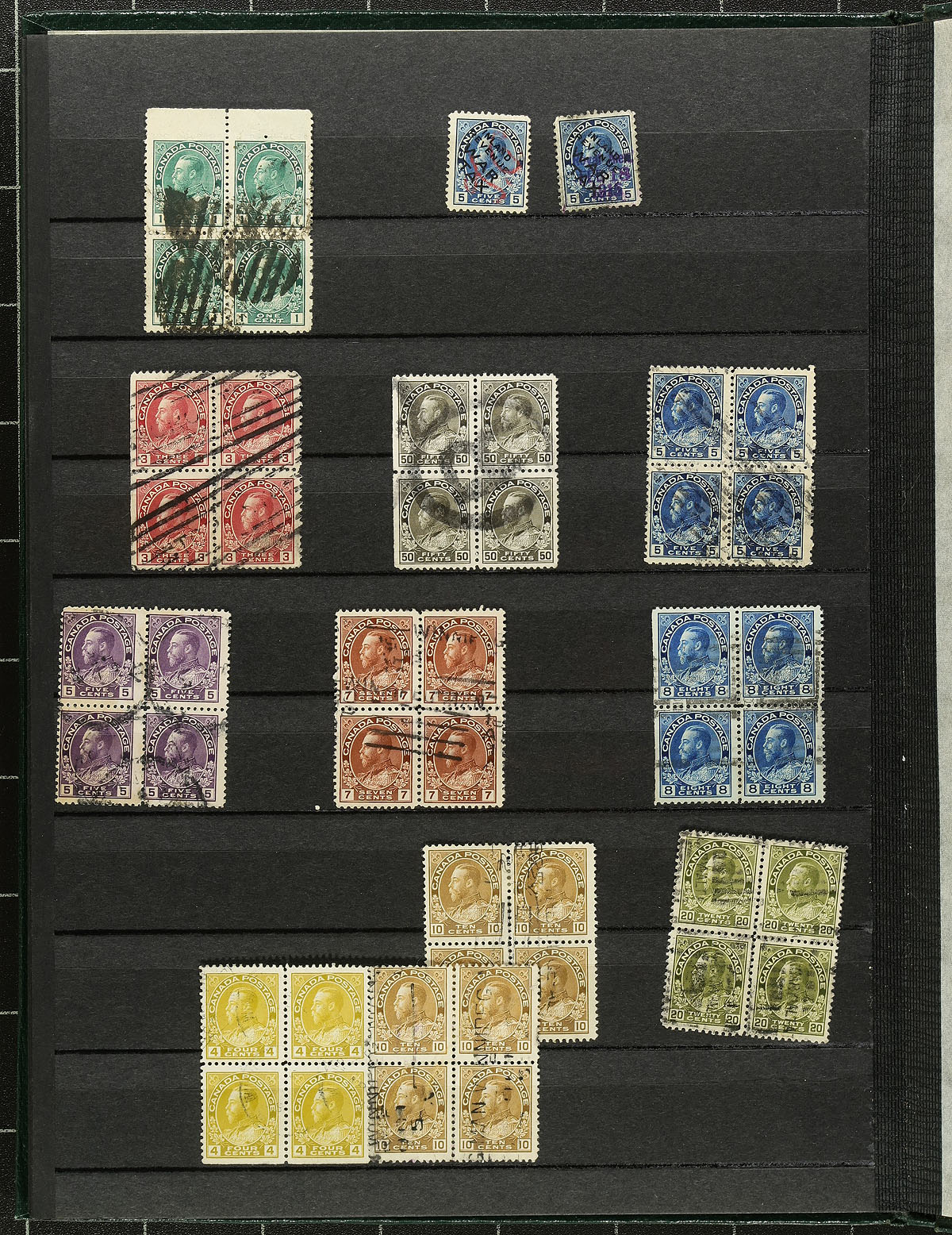 Accumulation of used Canada in a variety of formats, 1890's-1980's, containing a probable few thousand stamps, in several album pages, manila or stock pages, a stockbook, glassines, etc. A very quick check indicated some classic material, including a stockbook of used Admirals (roughly 150 in total), along with a few modern used booklet panes, souvenir sheets, and more. Postmark interest includes cds, duplex, modern postmarks, noting several 'socked on the nose' town cancels. Thorough investigation could yield better finds by the dedicated collector. Estimate =