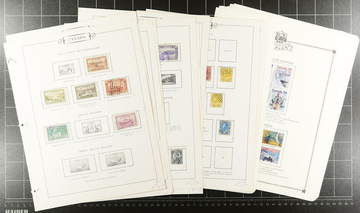 Accumulation of used Canada in a variety of formats, 1890's-1980's, containing a probable few thousand stamps, in several album pages, manila or stock pages, a stockbook, glassines, etc. A very quick check indicated some classic material, including a stockbook of used Admirals (roughly 150 in total), along with a few modern used booklet panes, souvenir sheets, and more. Postmark interest includes cds, duplex, modern postmarks, noting several 'socked on the nose' town cancels. Thorough investigation could yield better finds by the dedicated collector. Estimate =