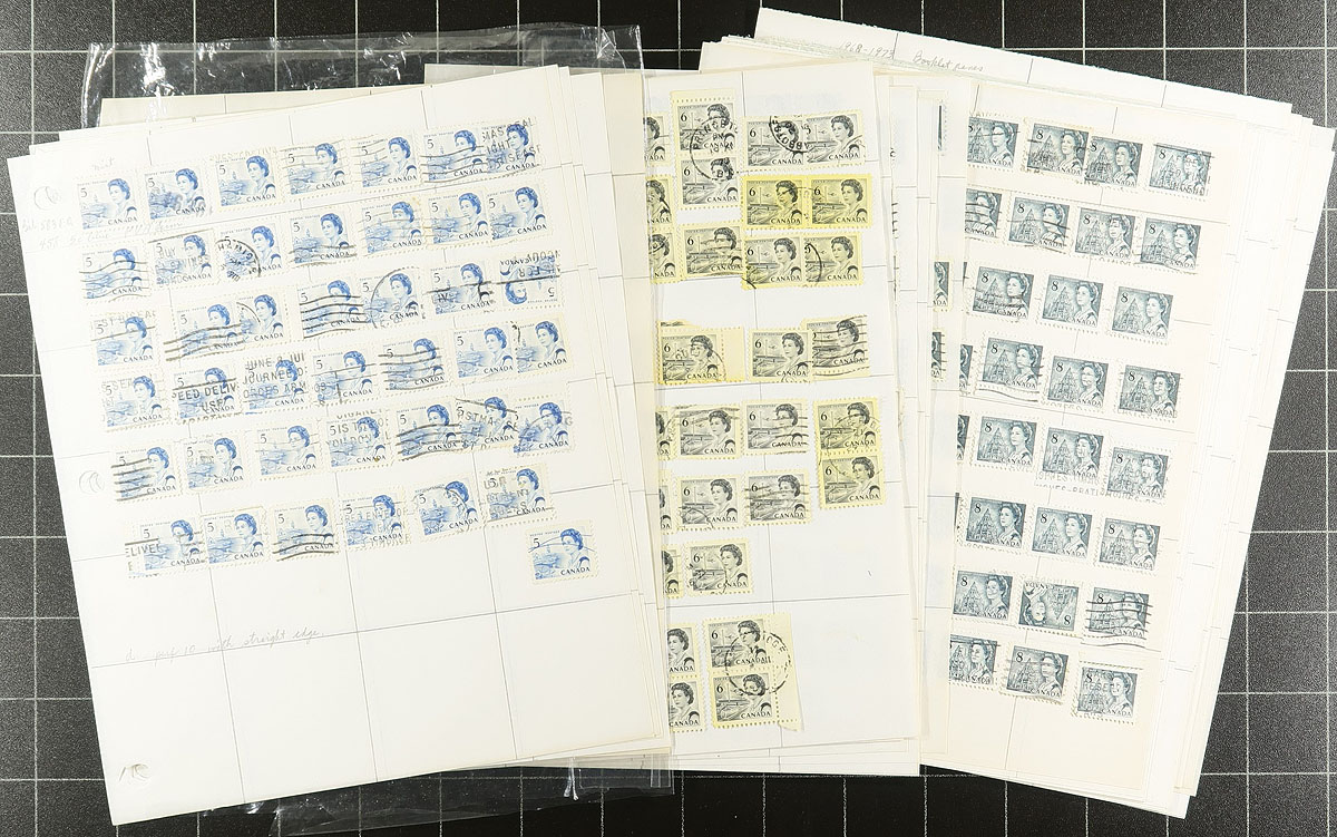 Accumulation of used Canada in a variety of formats, 1890's-1980's, containing a probable few thousand stamps, in several album pages, manila or stock pages, a stockbook, glassines, etc. A very quick check indicated some classic material, including a stockbook of used Admirals (roughly 150 in total), along with a few modern used booklet panes, souvenir sheets, and more. Postmark interest includes cds, duplex, modern postmarks, noting several 'socked on the nose' town cancels. Thorough investigation could yield better finds by the dedicated collector. Estimate =