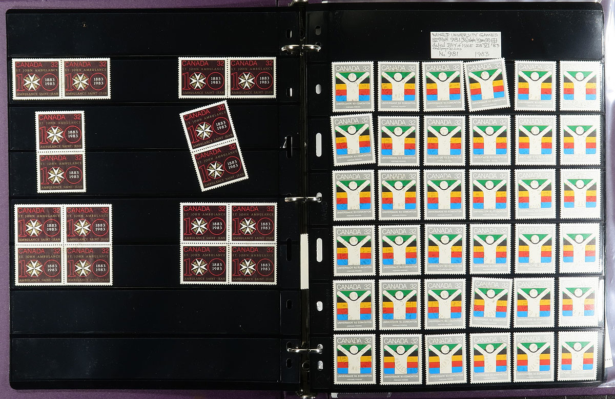 Accumulation of used Canada in a variety of formats, 1890's-1980's, containing a probable few thousand stamps, in several album pages, manila or stock pages, a stockbook, glassines, etc. A very quick check indicated some classic material, including a stockbook of used Admirals (roughly 150 in total), along with a few modern used booklet panes, souvenir sheets, and more. Postmark interest includes cds, duplex, modern postmarks, noting several 'socked on the nose' town cancels. Thorough investigation could yield better finds by the dedicated collector. Estimate =