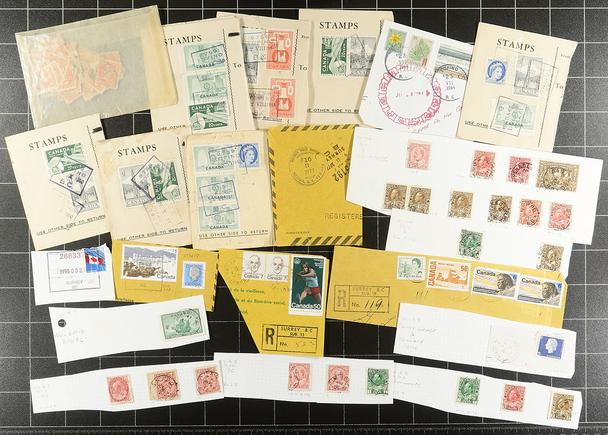 Eclectic lot collected for town postmarks, roughly 600 in total on and off piece, in a few small stockbooks, several homemade pages, and loose odds and ends. A cursory check indicated material generally from the 1930's to the 1980's, with material possible on either side of the given range, noting several pages of Alberta 'socked on the nose' town postmarks, an accumulation of a few hundred New Brunswick town postmarks, a few pages of registration box handstamps from envelopes, and more. A nice lot for Canada postmark collector, overall fine to very fine. Estimate =