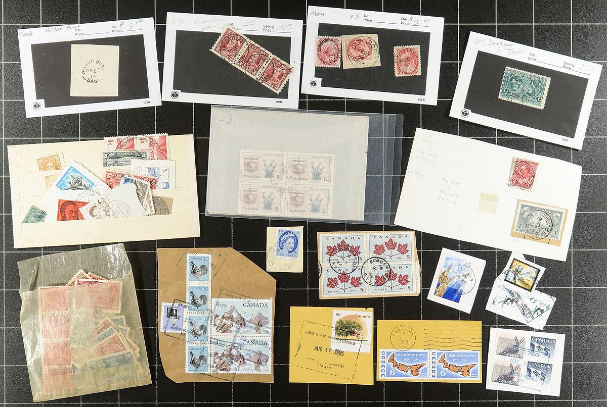 Eclectic lot collected for town postmarks, roughly 600 in total on and off piece, in a few small stockbooks, several homemade pages, and loose odds and ends. A cursory check indicated material generally from the 1930's to the 1980's, with material possible on either side of the given range, noting several pages of Alberta 'socked on the nose' town postmarks, an accumulation of a few hundred New Brunswick town postmarks, a few pages of registration box handstamps from envelopes, and more. A nice lot for Canada postmark collector, overall fine to very fine. Estimate =