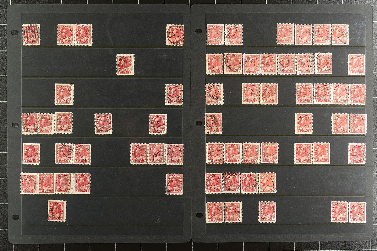Eclectic lot collected for town postmarks, roughly 600 in total on and off piece, in a few small stockbooks, several homemade pages, and loose odds and ends. A cursory check indicated material generally from the 1930's to the 1980's, with material possible on either side of the given range, noting several pages of Alberta 'socked on the nose' town postmarks, an accumulation of a few hundred New Brunswick town postmarks, a few pages of registration box handstamps from envelopes, and more. A nice lot for Canada postmark collector, overall fine to very fine. Estimate =