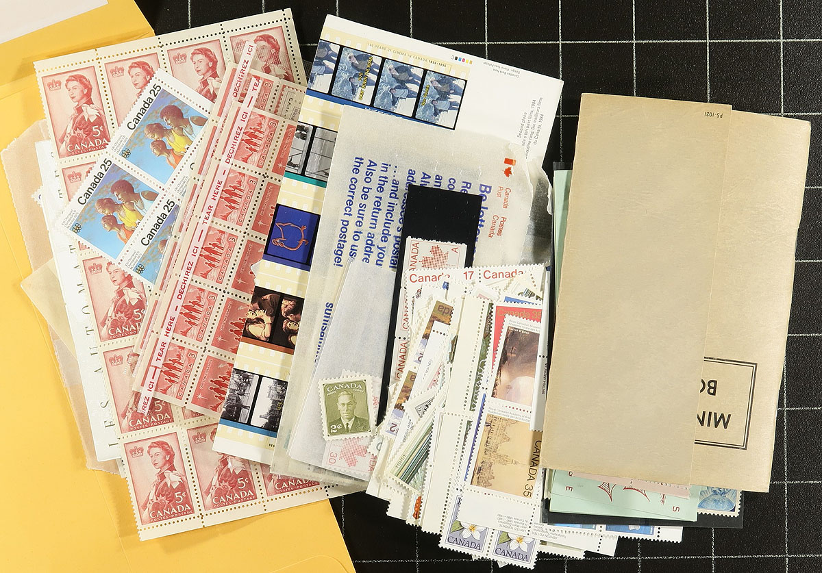 Collection / accumulation of primarily never hinged Canada, 1930's-1980's, containing many hundreds of stamps in an album, stockbook, and loose material. The lot begins with a Unity album, containing pages from 1851 up to 1993, with stamps only from the mid 1980s to the early 1990's, along with a stockbook of primarily hinged material from the Admirals period onward. The bulk of the lot is the loose material noting several singles, blocks and plate blocks, mostly from the 1960's to the 1980's. Face value alone is over $200, with some material cataloging in the $10 range. A nice start to a mint Canada collection. Estimate =