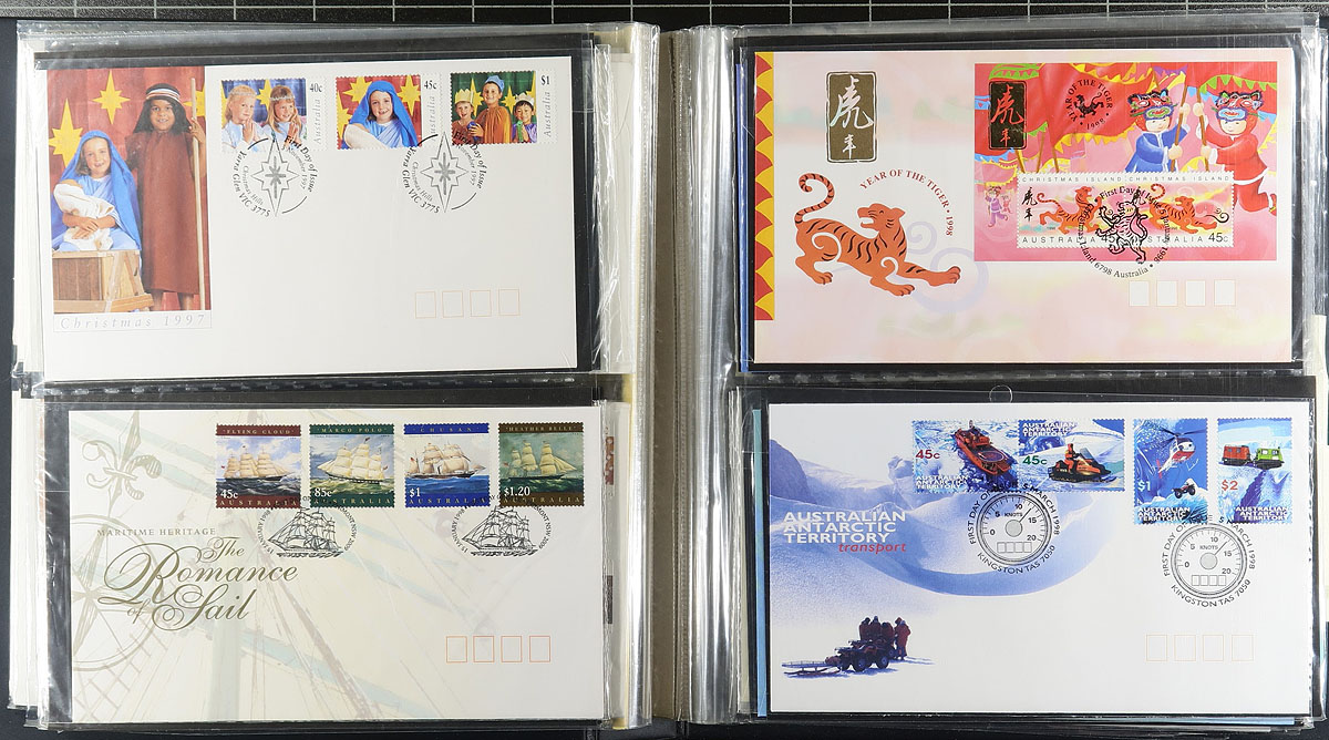 Group of roughly 375 Australia first day covers, 1960's-2008, in 5 albums with some loose material. We note singles, sets, and high denomination frankings, noting private cachet makers WCS, Royal, Parade Covers, just to name a few. A nice lot for the cover collector, overall very fine. Estimate =