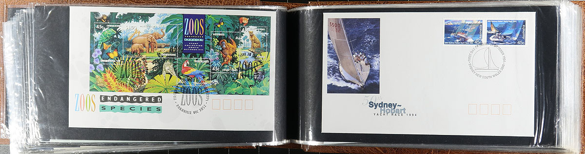 Group of roughly 375 Australia first day covers, 1960's-2008, in 5 albums with some loose material. We note singles, sets, and high denomination frankings, noting private cachet makers WCS, Royal, Parade Covers, just to name a few. A nice lot for the cover collector, overall very fine. Estimate =