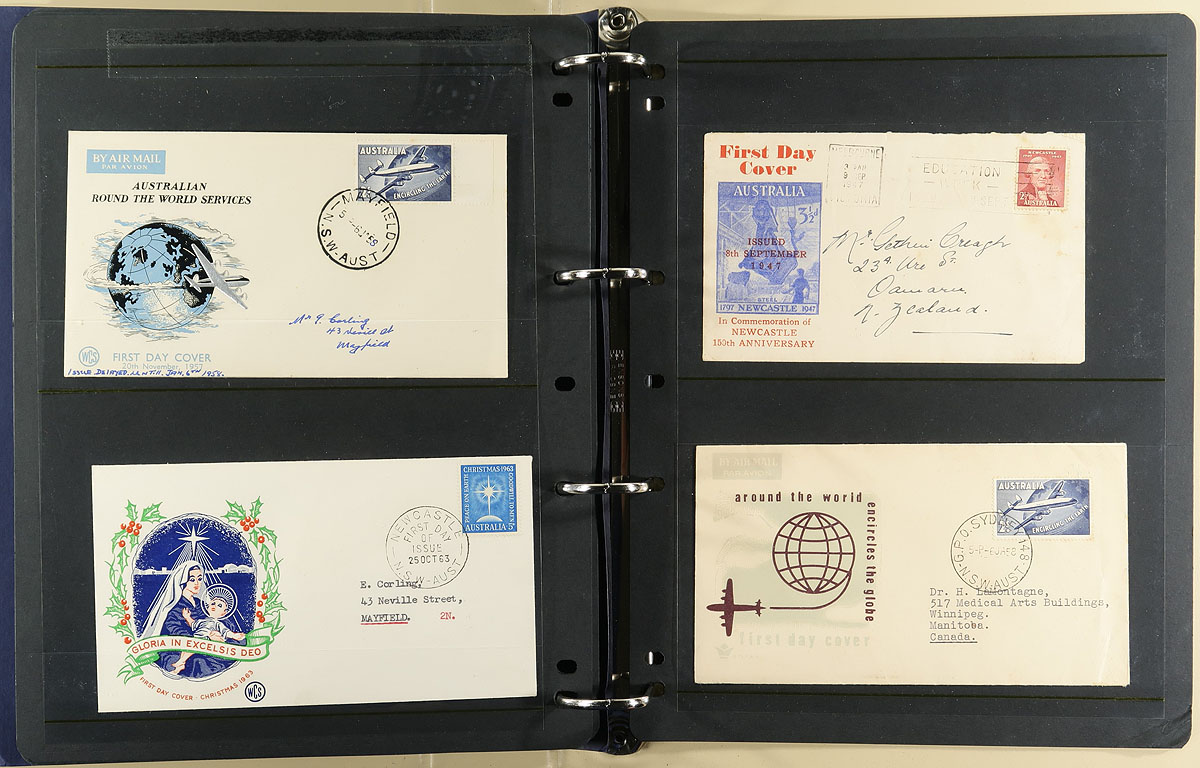 Group of roughly 375 Australia first day covers, 1960's-2008, in 5 albums with some loose material. We note singles, sets, and high denomination frankings, noting private cachet makers WCS, Royal, Parade Covers, just to name a few. A nice lot for the cover collector, overall very fine. Estimate =