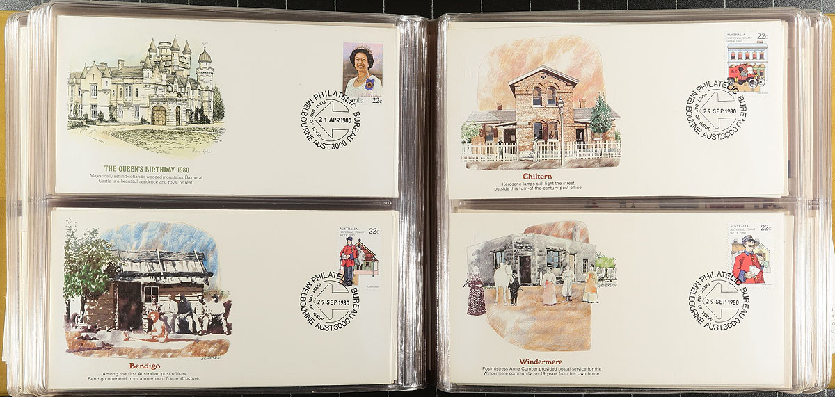 Group of roughly 350 Australia first day covers, 1980's-1990's, in 4 albums. The first two albums from the Australian FDC Society contain material from the 1980s, with the two Australia Post FDC albums containing material from the 1990's, with both having primarily singles and sets frankings, along with a few Australian Antarctic Territory covers. A nice lot for cover collectors, overall very fine. Estimate =