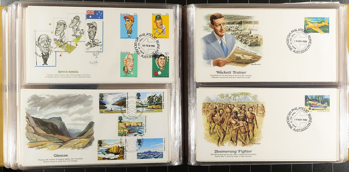 Group of roughly 350 Australia first day covers, 1980's-1990's, in 4 albums. The first two albums from the Australian FDC Society contain material from the 1980s, with the two Australia Post FDC albums containing material from the 1990's, with both having primarily singles and sets frankings, along with a few Australian Antarctic Territory covers. A nice lot for cover collectors, overall very fine. Estimate =