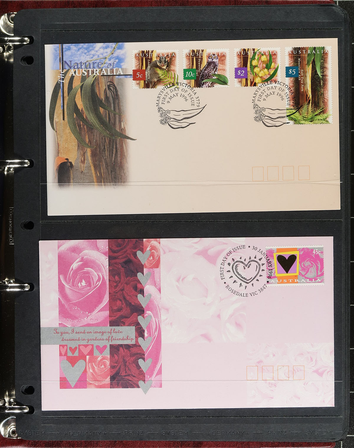 Group of roughly 350 Australia first day covers, 1980's-1990's, in 4 albums. The first two albums from the Australian FDC Society contain material from the 1980s, with the two Australia Post FDC albums containing material from the 1990's, with both having primarily singles and sets frankings, along with a few Australian Antarctic Territory covers. A nice lot for cover collectors, overall very fine. Estimate =
