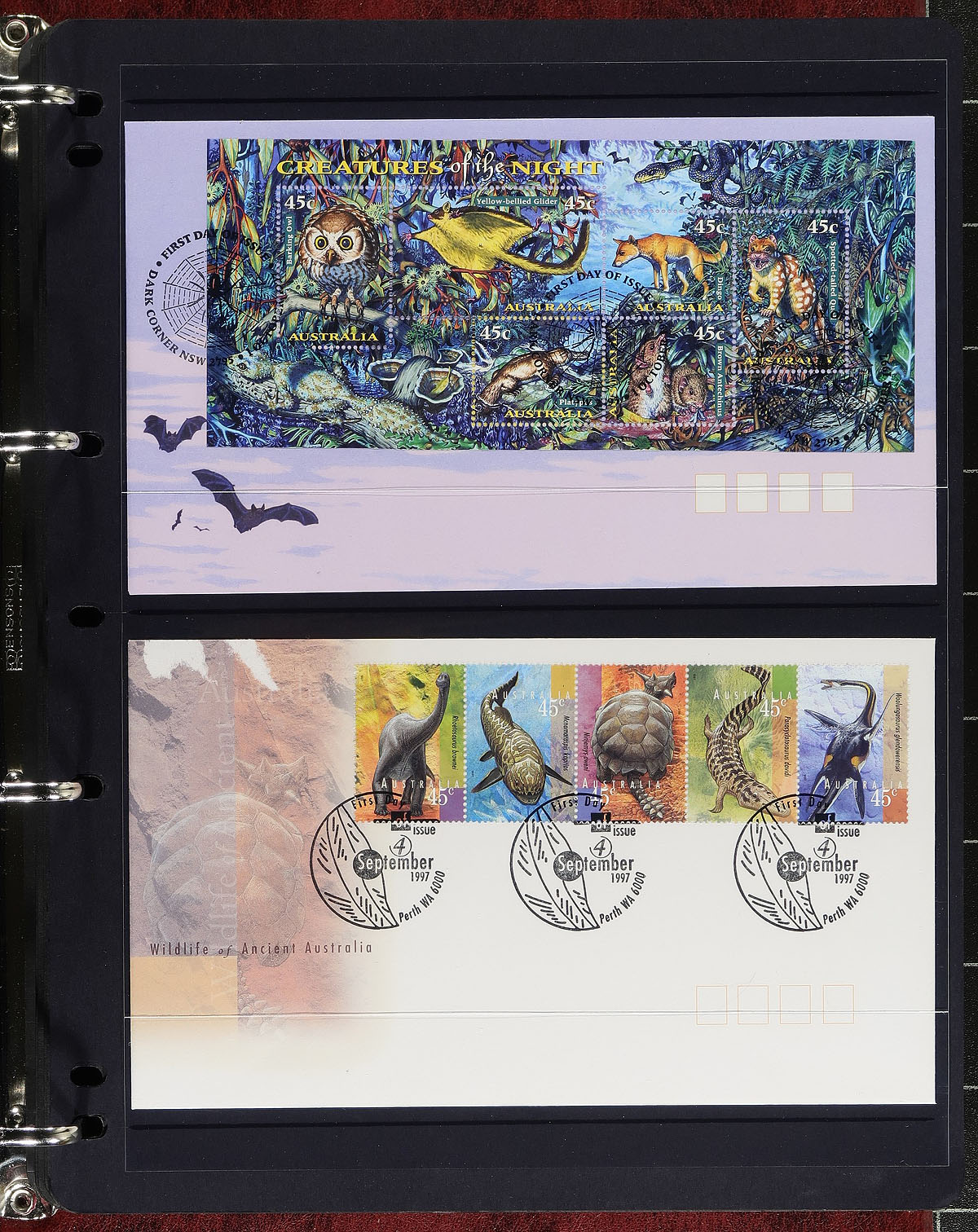Group of roughly 350 Australia first day covers, 1980's-1990's, in 4 albums. The first two albums from the Australian FDC Society contain material from the 1980s, with the two Australia Post FDC albums containing material from the 1990's, with both having primarily singles and sets frankings, along with a few Australian Antarctic Territory covers. A nice lot for cover collectors, overall very fine. Estimate =